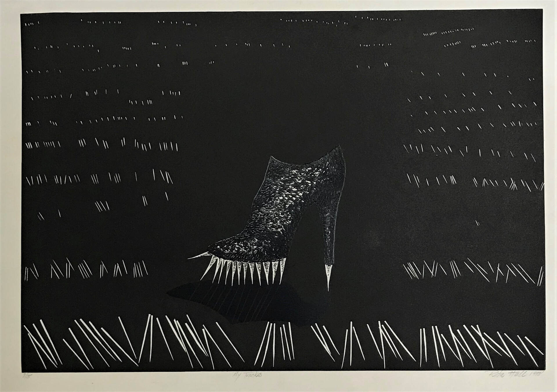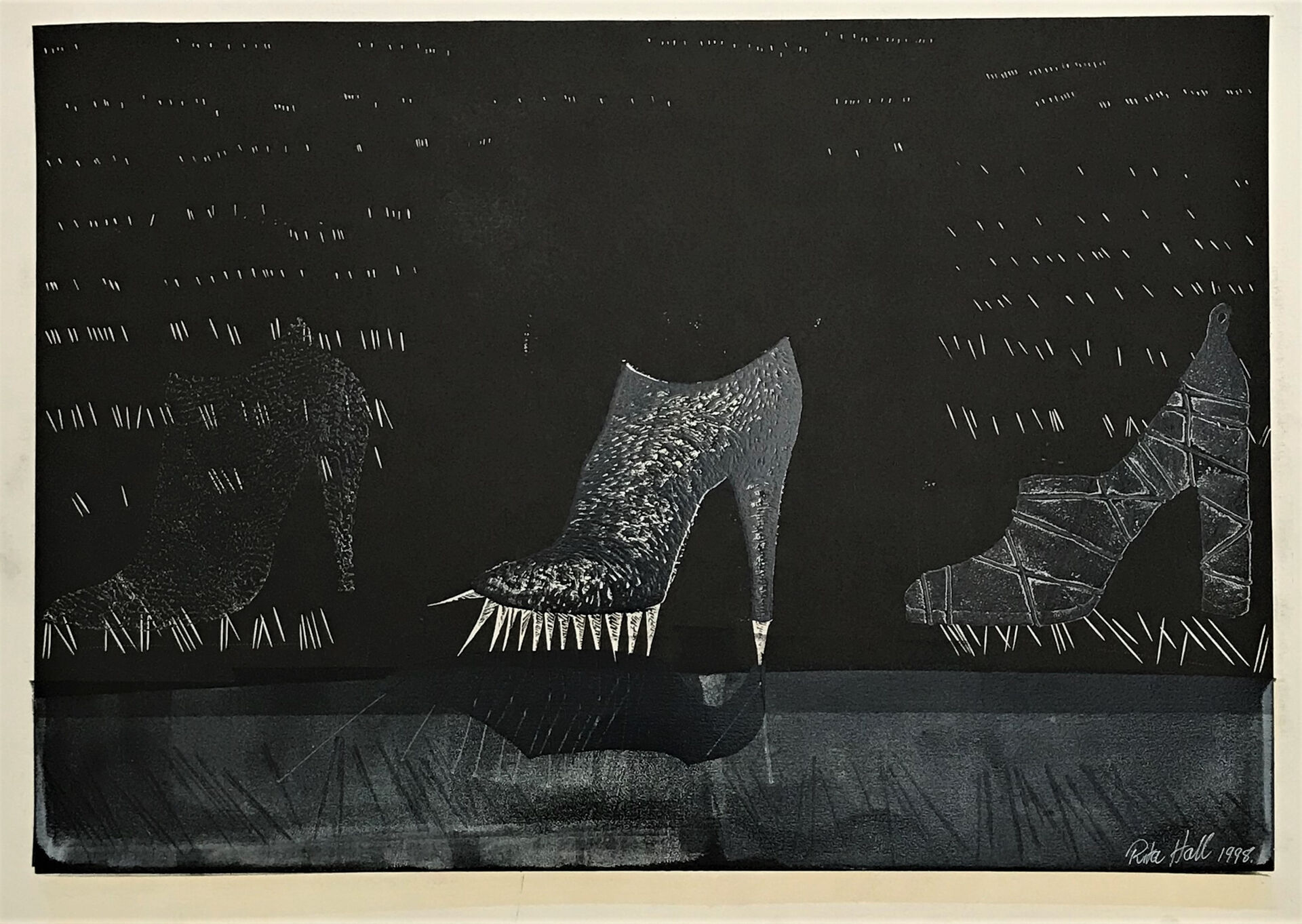 The leather off-cuts from the bag maker came in handy again and I made a collection of collages of shoe shapes with bindings, bandages, spikes and all manner of coverings to suggest pain in their wearing. The resulting prints in collographs, etchings and some linocuts were in small or unique state editions on paper. The collection was exhibited at Art Images Gallery, Norwood in 1998 along with the matrices of collages. I re-visited some of them recently in 2020, printing them and adding watercolours in bright cheerful colours.