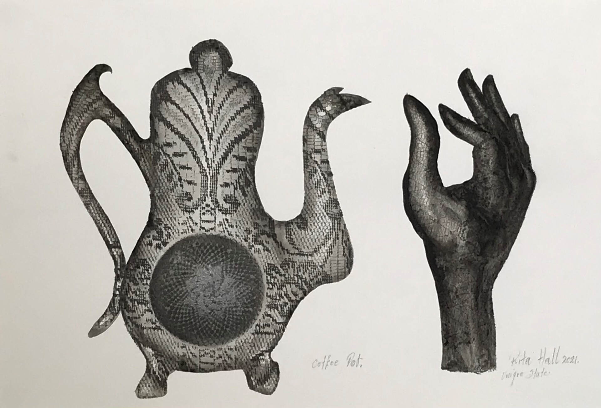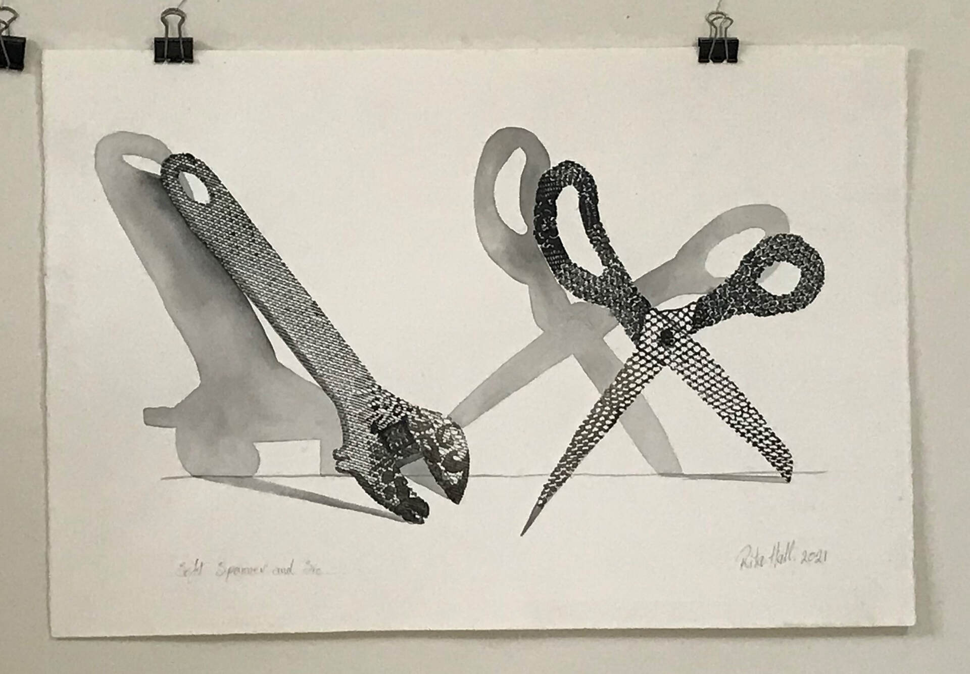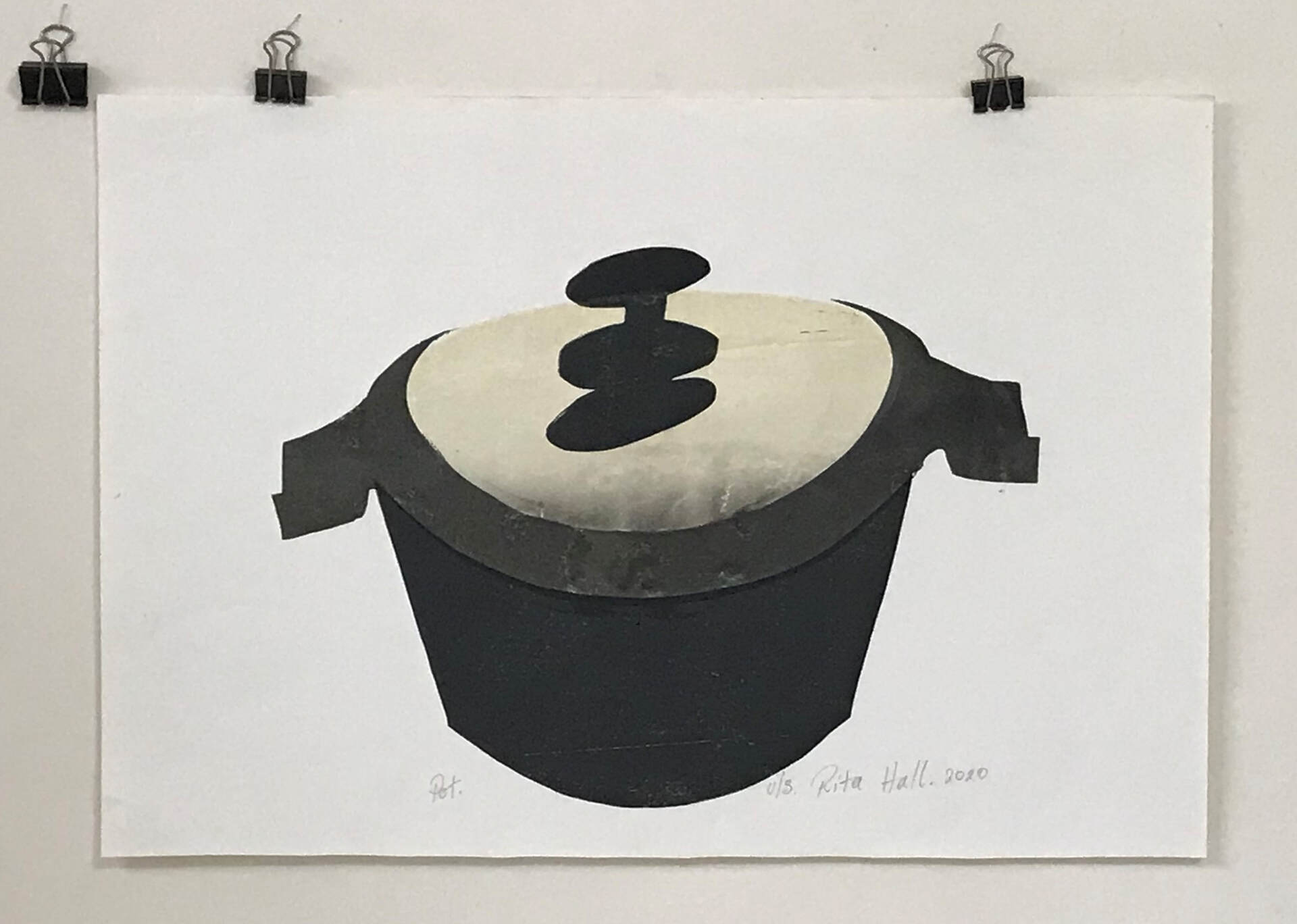There was nothing I could do but make new work. I could express in a new way subjects and arrangements which gave me comfort. As a starting point, I turned to the simple and ordinary objects in my life and home, those that were familiar and comforting. The kettle; the teapot; tools; loved pots and anything normal; Nothing new there: many artists look to their environment to make art, but I also wanted to explore some original techniques I had developed over the previous 20 years. But I placed various tough restrictions on myself: keep it simple, straight forward, dead pan. Draw only from the objects within the genre of still life. Use no colour at all, allow only black and white tones. Exploit materials already to hand like ink, rollers, papers, water colours, and no new art shopping. No gratuitous decoration or sentimentality. And, above all, have some fun!