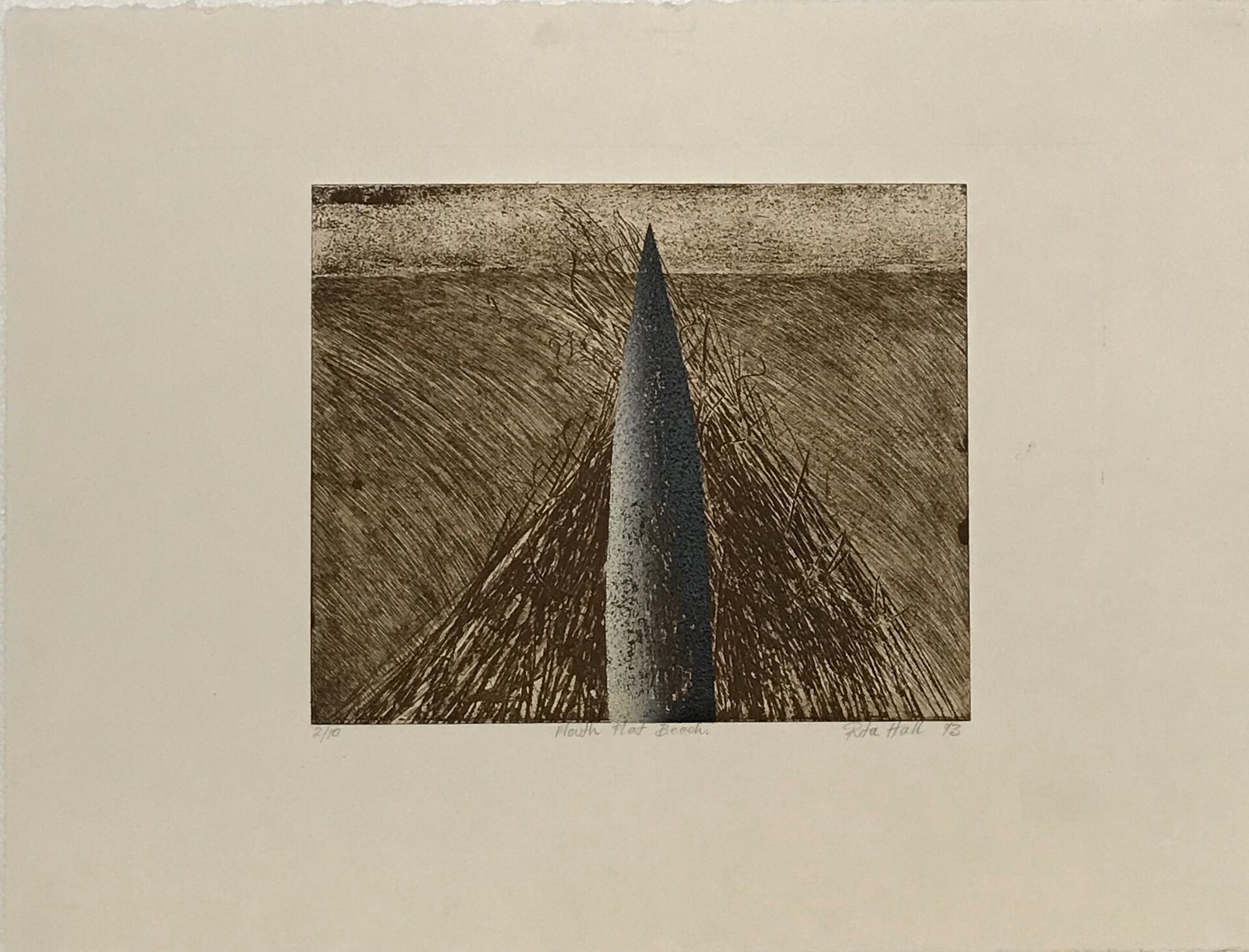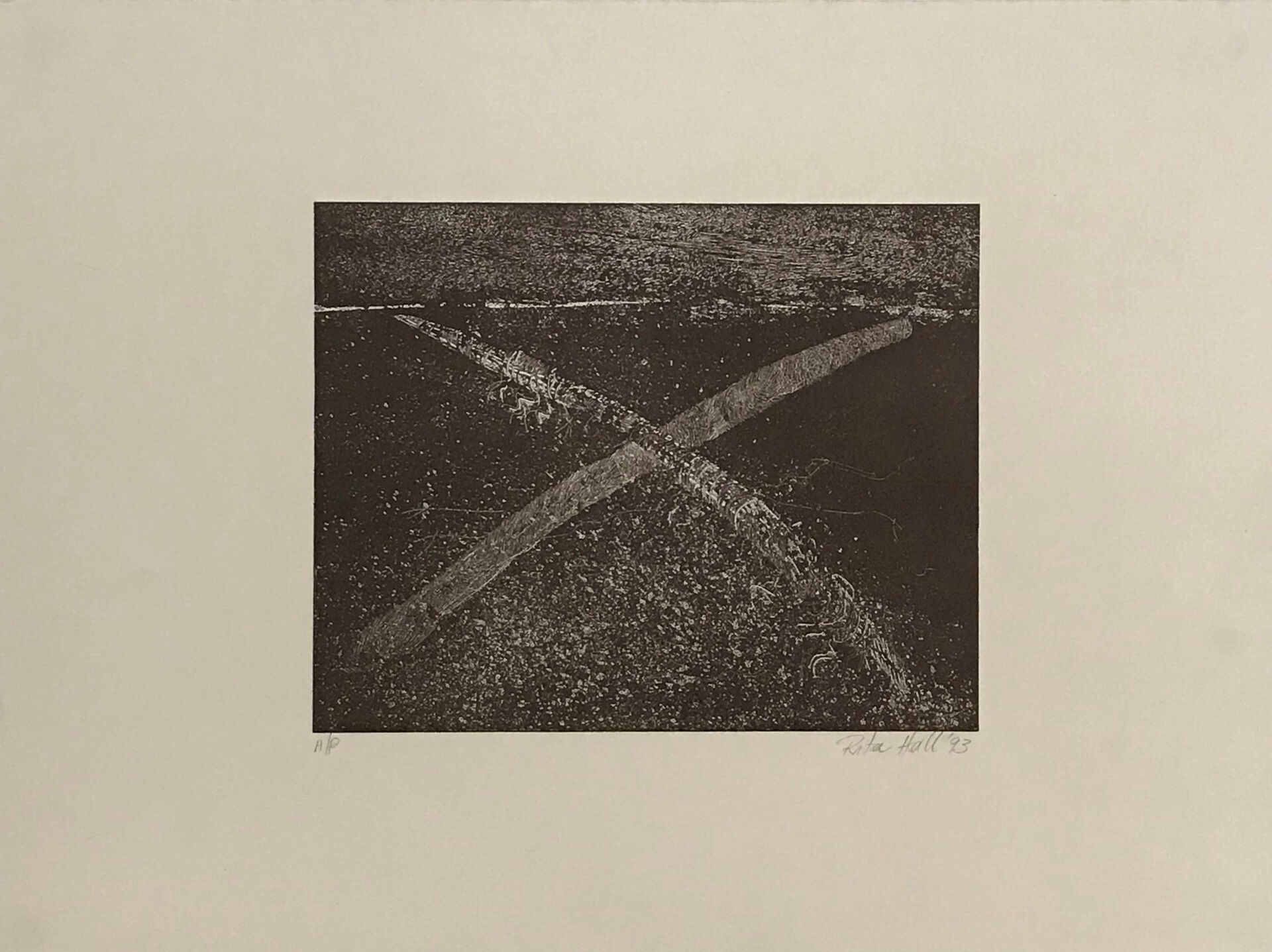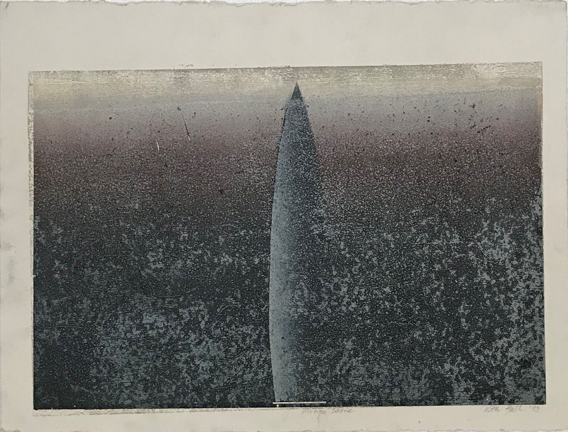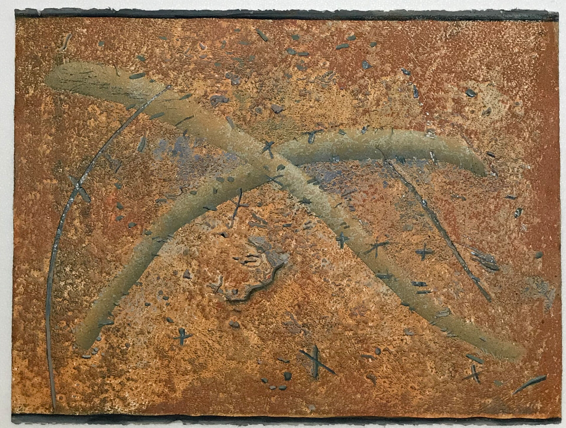 The new works had changed direction, encompassing both Shaped Stone and landscape. Techniques included etching, collographs, relief printing and I started cutting metal shapes with tin snips which were printed as blends over etchings. An edition of 35 of these were commissioned by the Print Council of Australia as a members print. Another location in Kangaroo Island at Mouth flat Beach also inspired me to find similar type shapes in the beach litter washed into natural arrangements by the huge waves and winds. The stones now became forms of wood, seaweed, pebbles. So this series of work developed, with Lake Mungo series into another body of works, all inspired by the original stones.