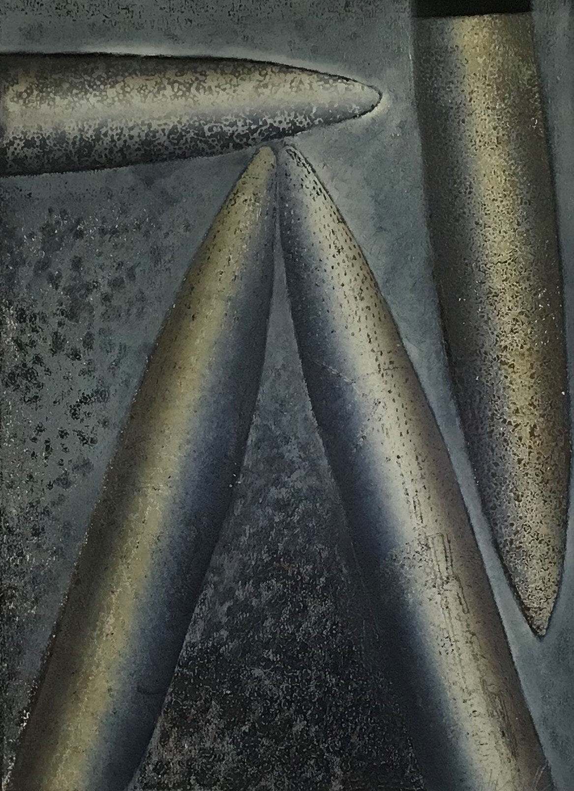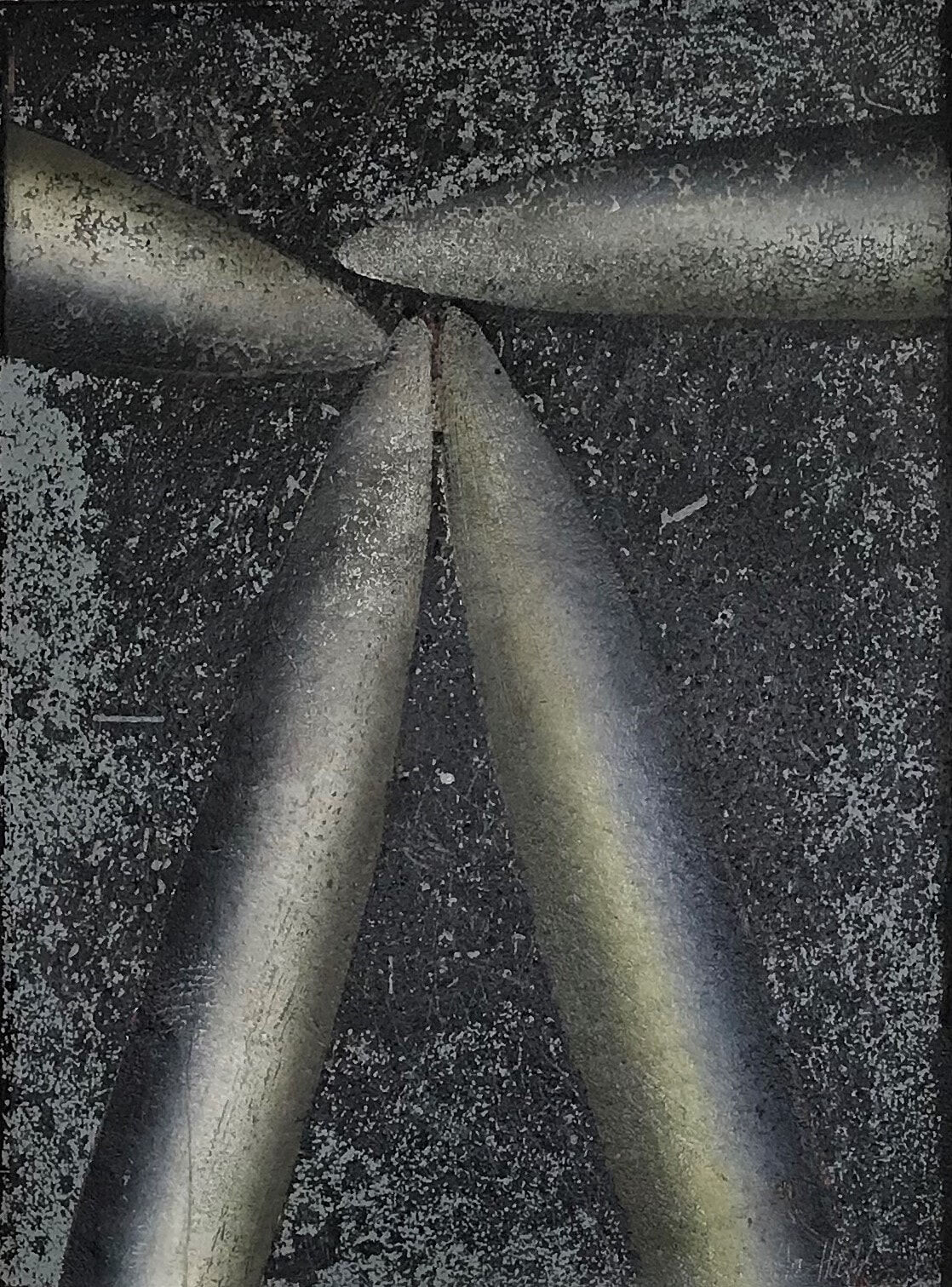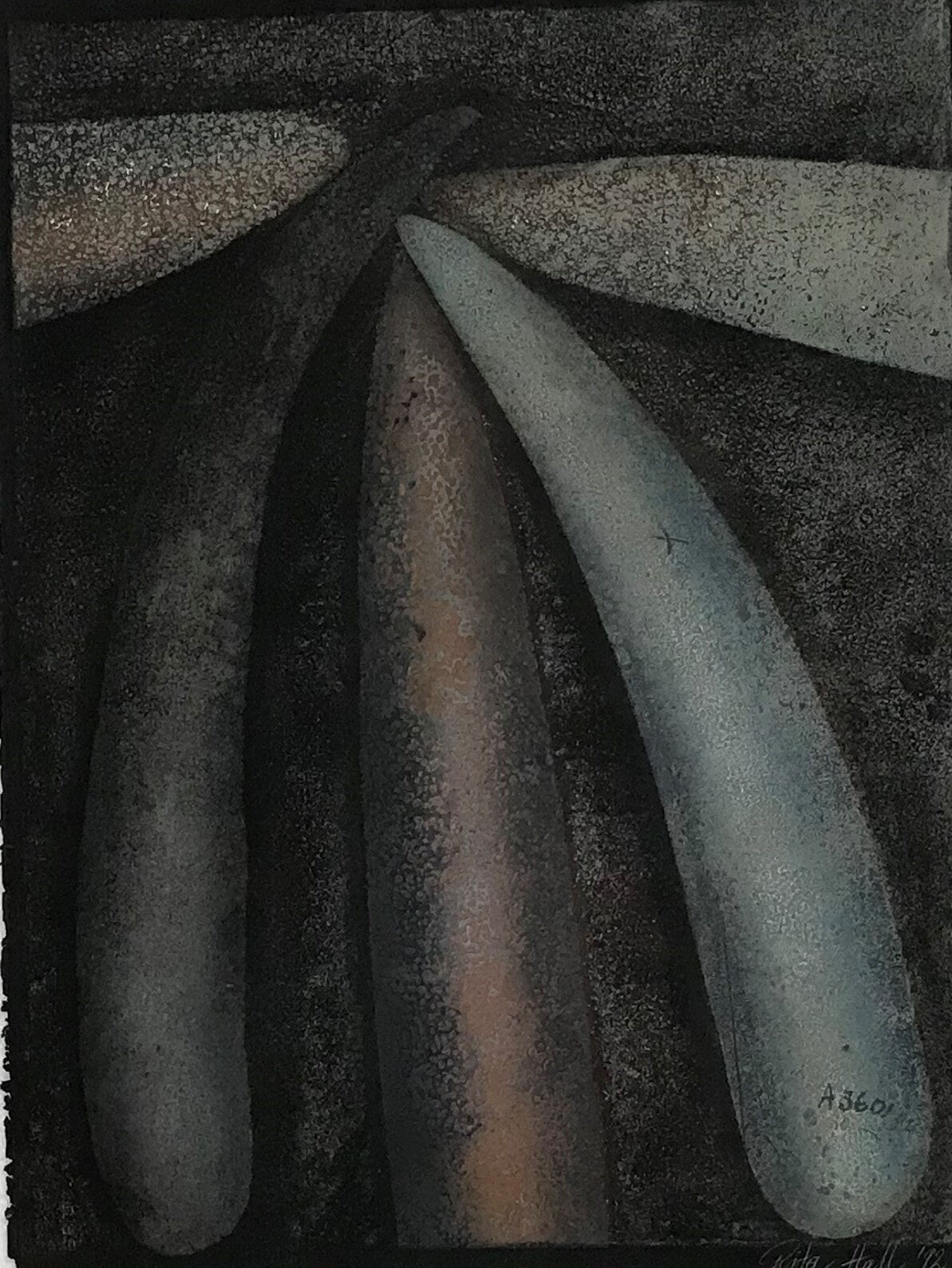 Professor Peter Sutton from the SA Museum saw some finished art works of these forms and suggested to me that they reminded him of particular shaped stones in the collection. The patterns and marks I had made were similar to the engravings and marks made on these stones. He showed me some photographs of them, and it was remarkable to see the similarity. I was able to see some specimens in the museum, they were made of various stone and I became entranced with them. These shaped stones became the subject and the major interest for the following 2 years.