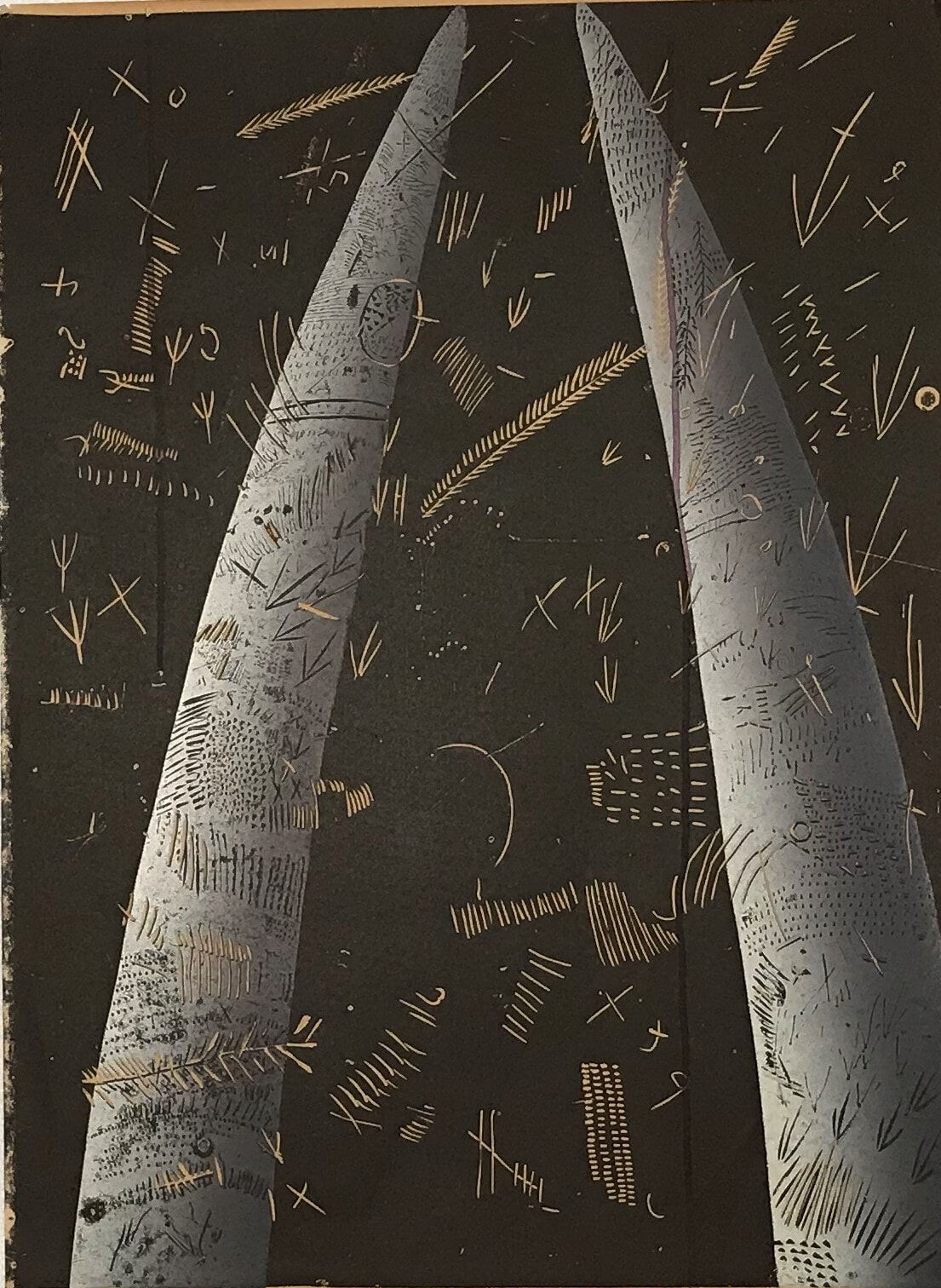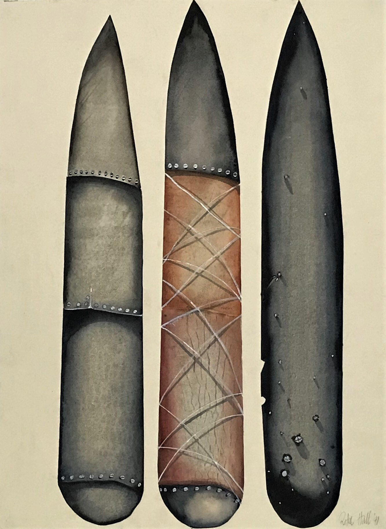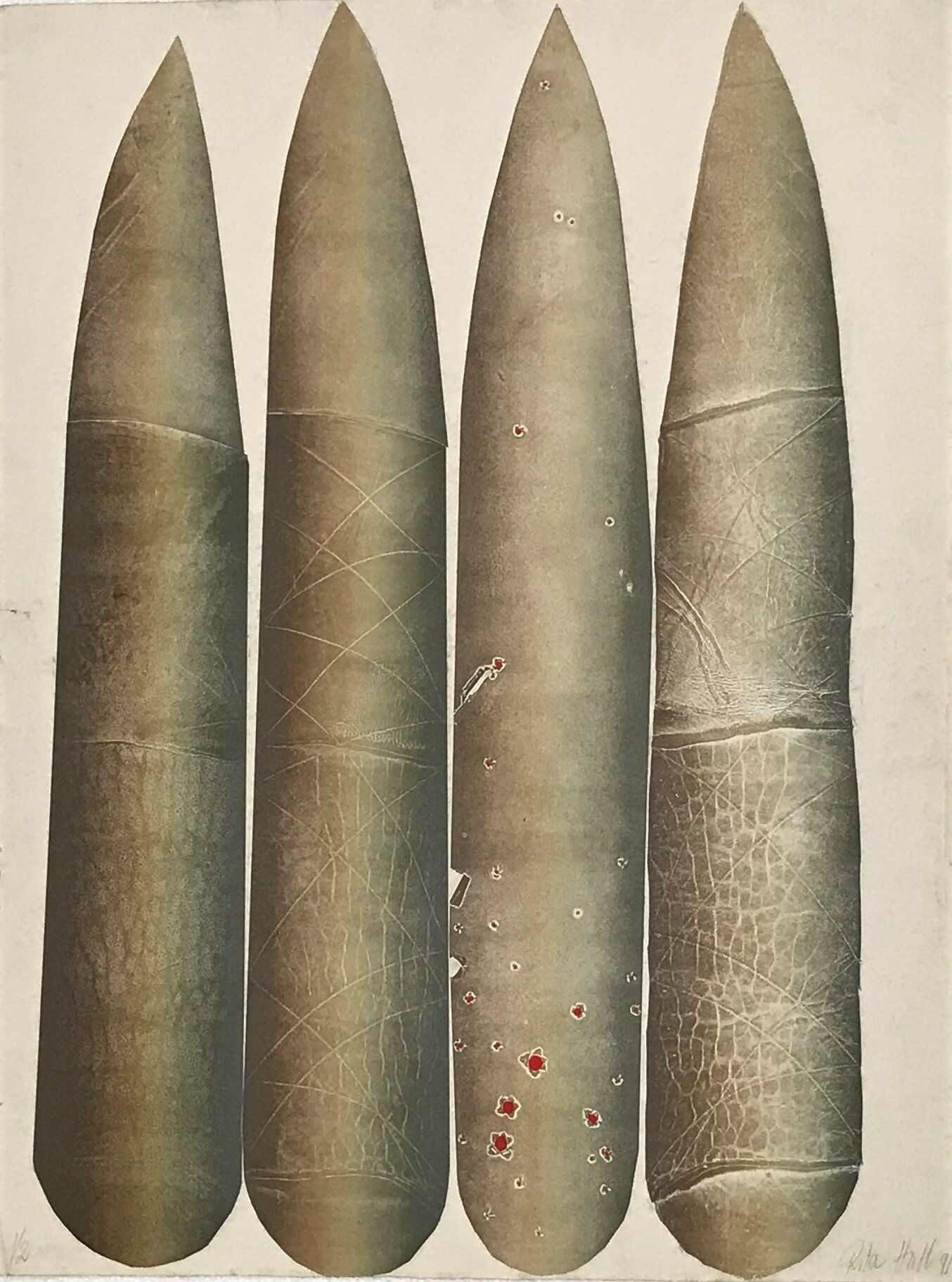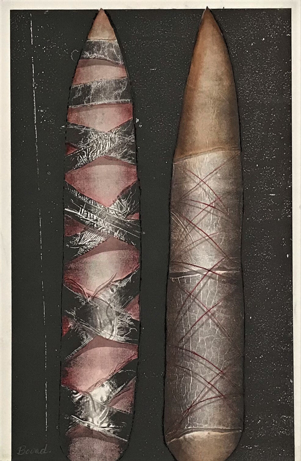 The round shapes of stones began to become elongated into bullet like forms, I expressed them through etching, lino cuts, pastels and started to bind them with decorative wrappings of leather, lace and fabrics. They looked almost primitive and yet very mysterious. I enjoyed making them enormously and arranged them in pairs or groups.