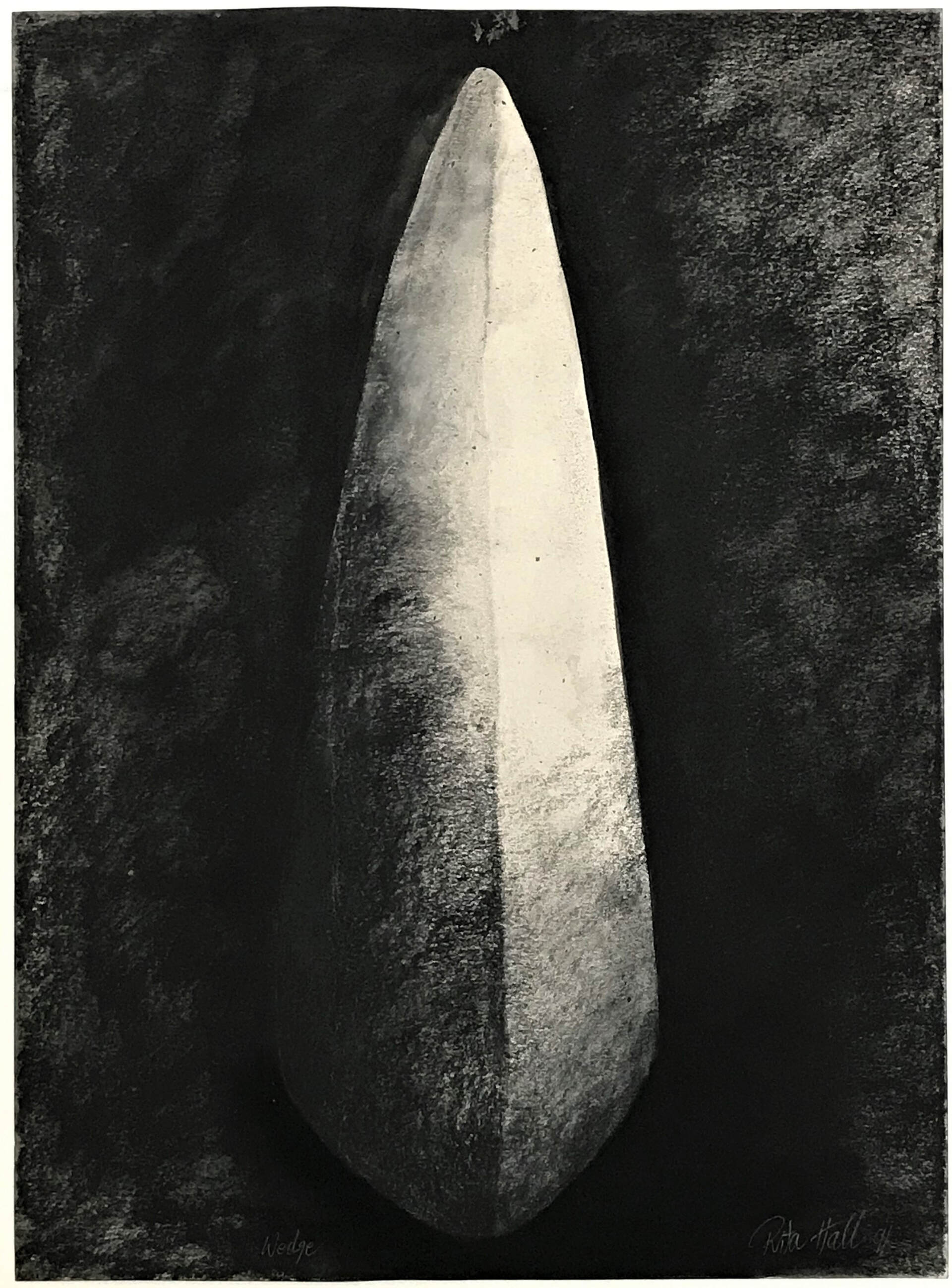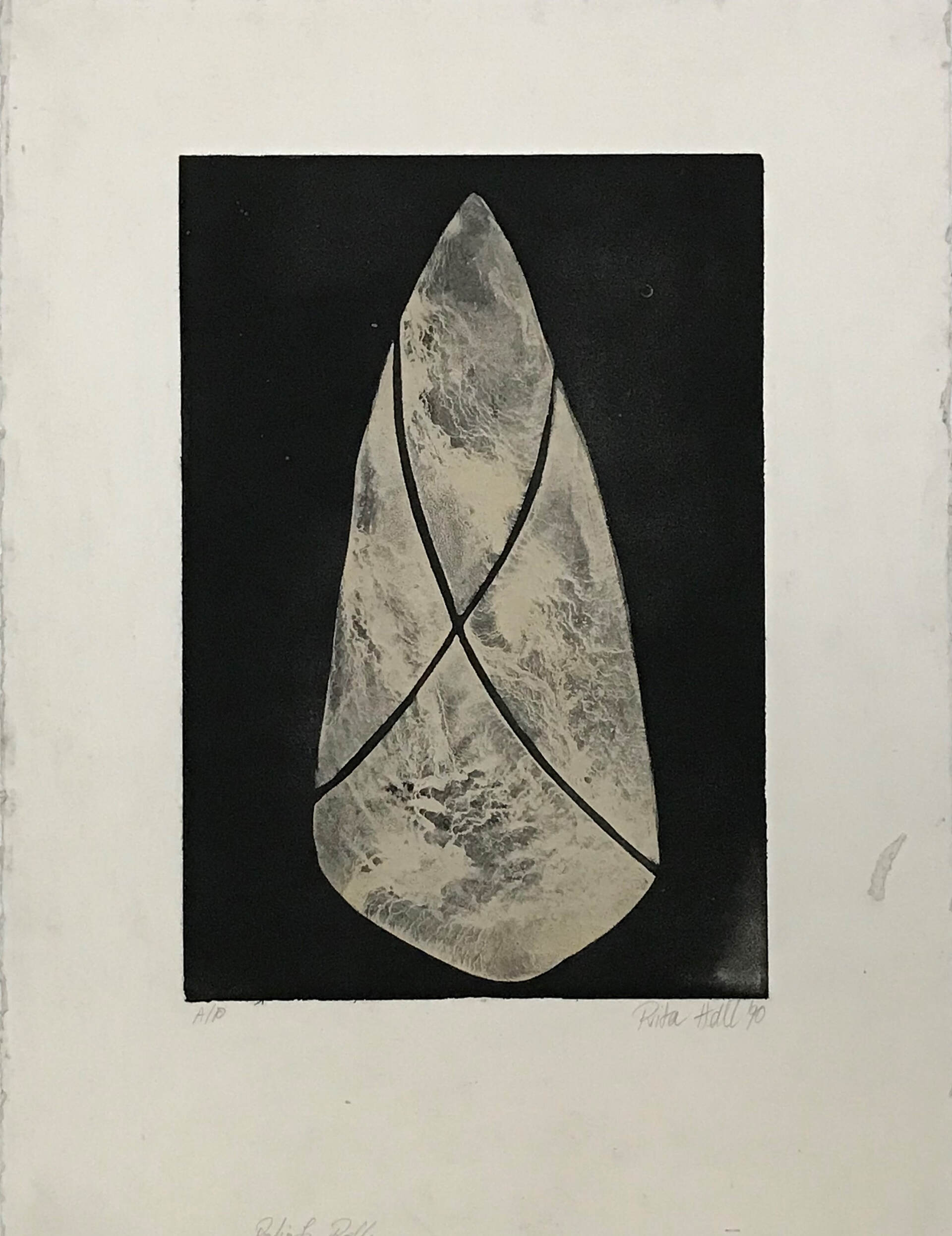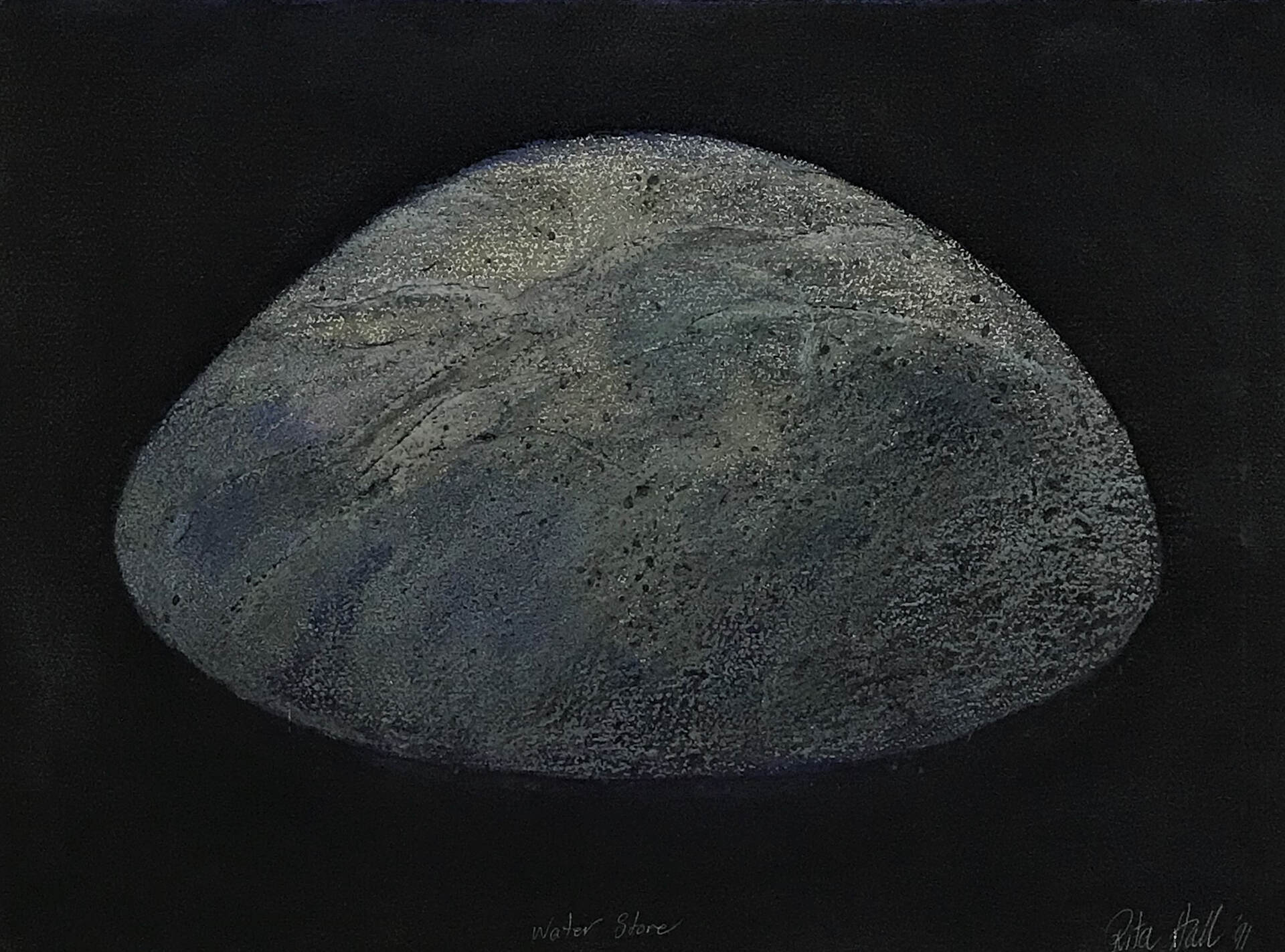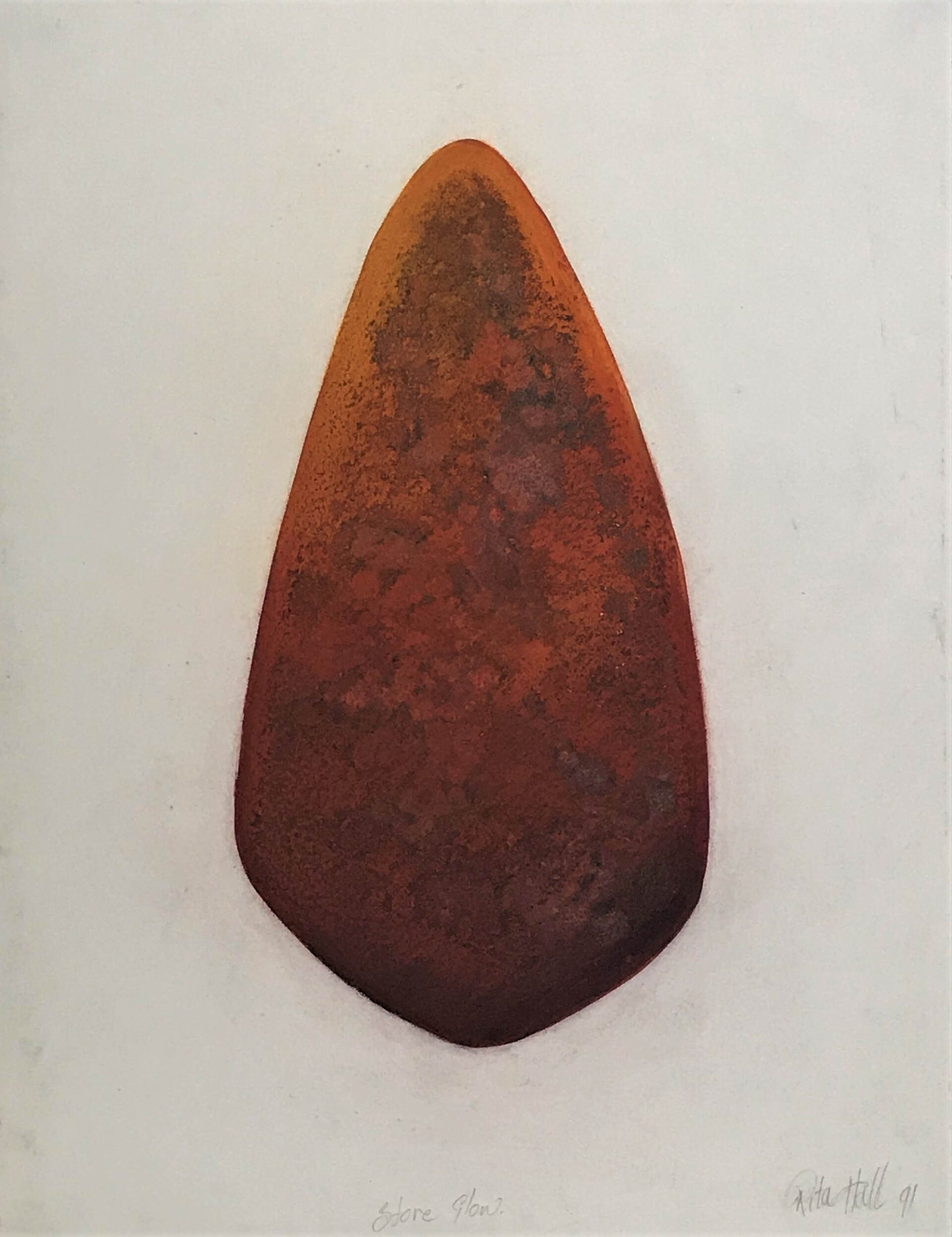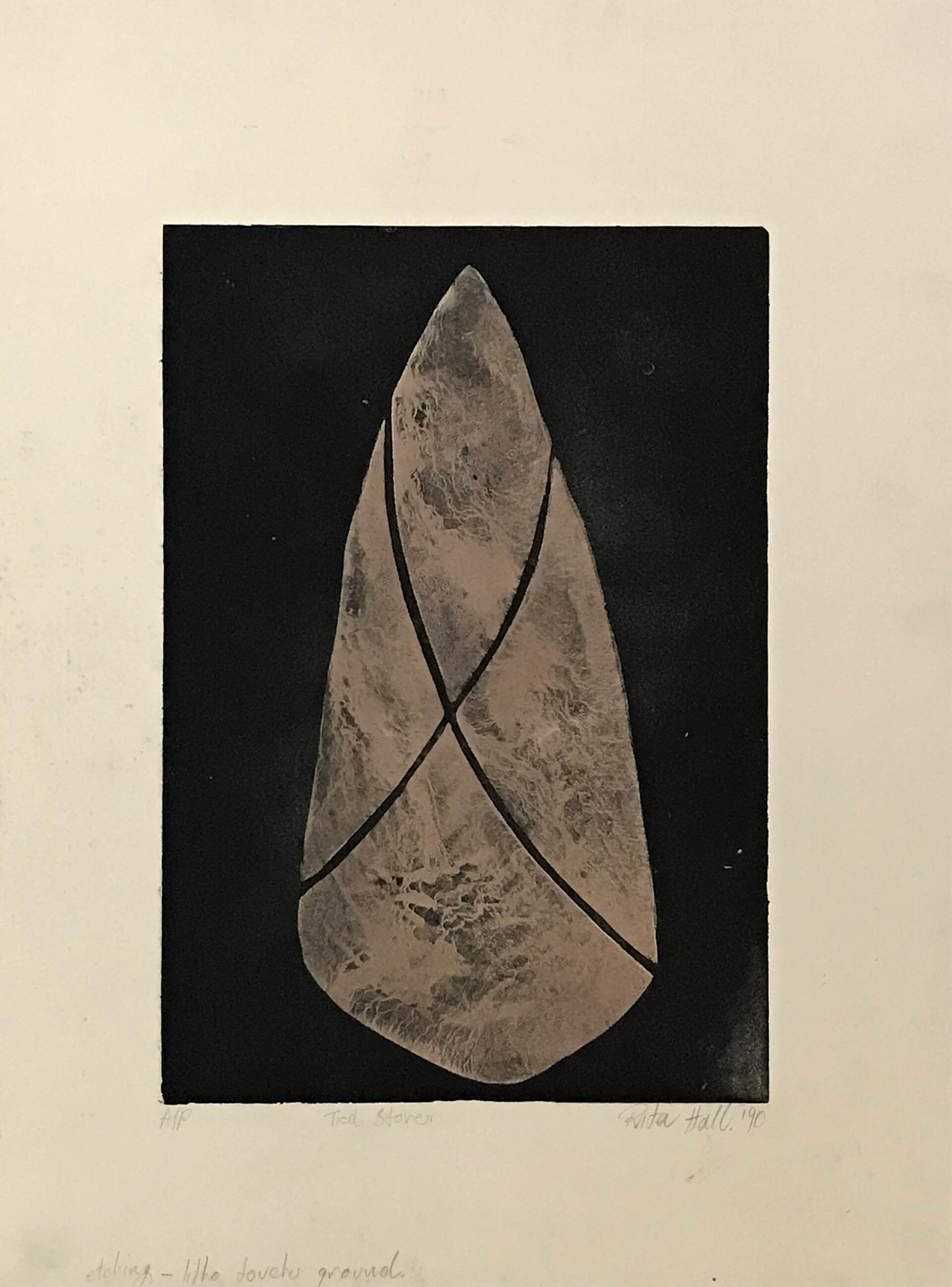 A grain of sand became a rounded stone in a picture, in a space, with a shape, with a dimension, a surface, a shadow perhaps, a solidarity, with its weight and all full of possibility. So began a new starting point rich with the potential for the making of future art works. I began a collection of rounded stones. Some were abandoned but many became models for drawings. They were exploited for many reasons and a body of new works became manifest. I made collographs, lino prints, etchings, lithographs, with also many drawings, paintings and pastels. A small group of the stone works were exhibited at Reade Art Gallery in 1990.