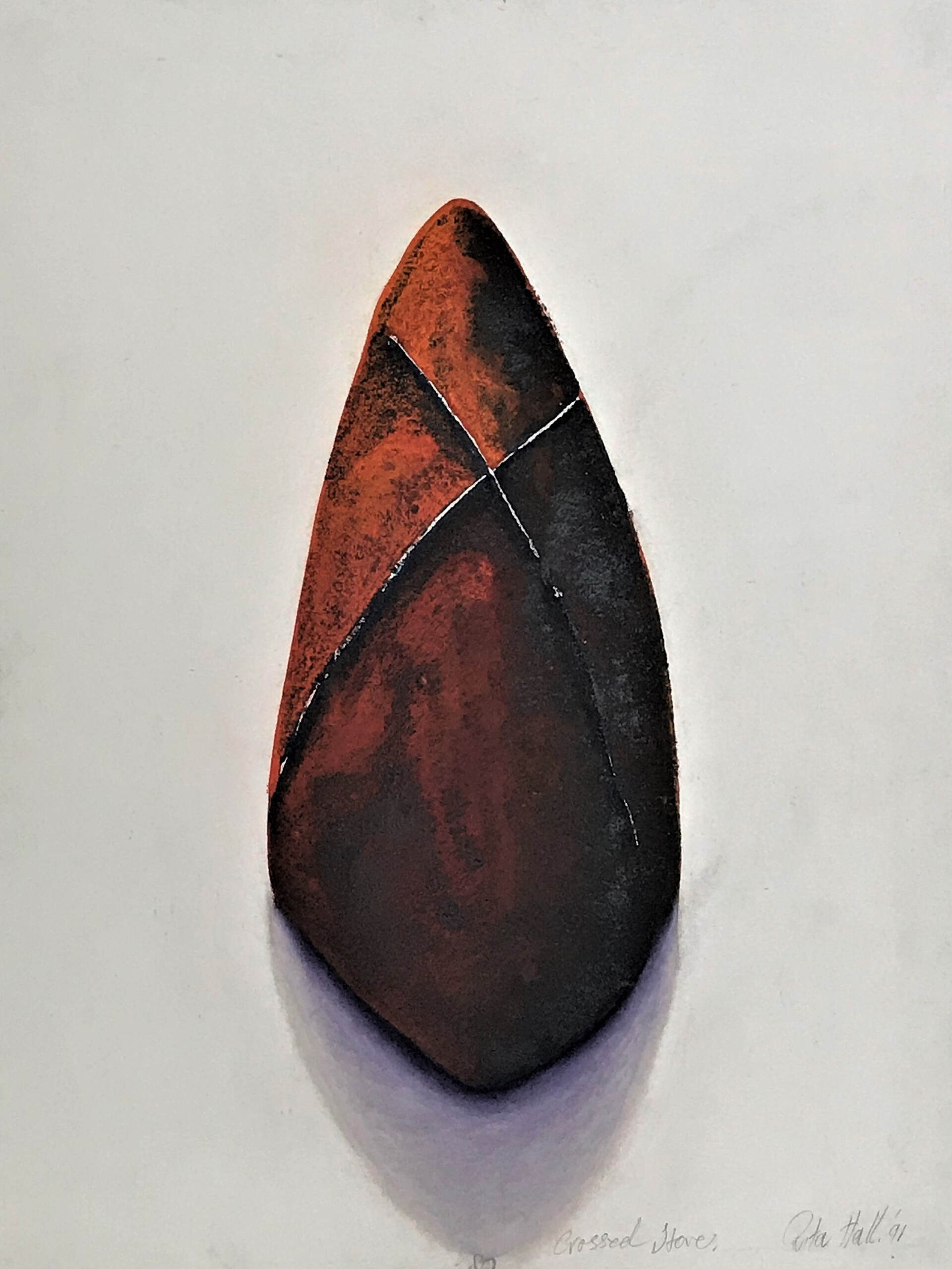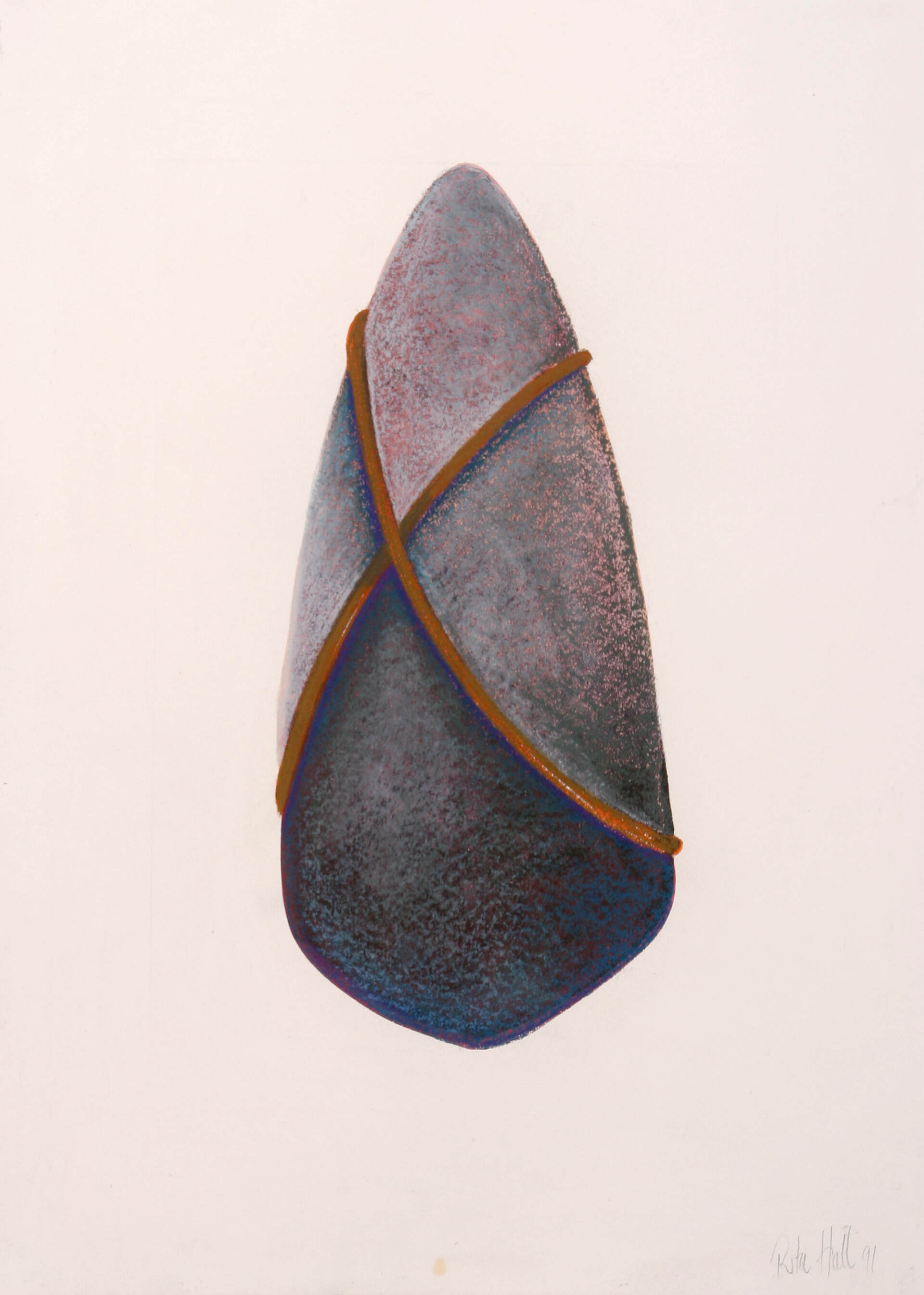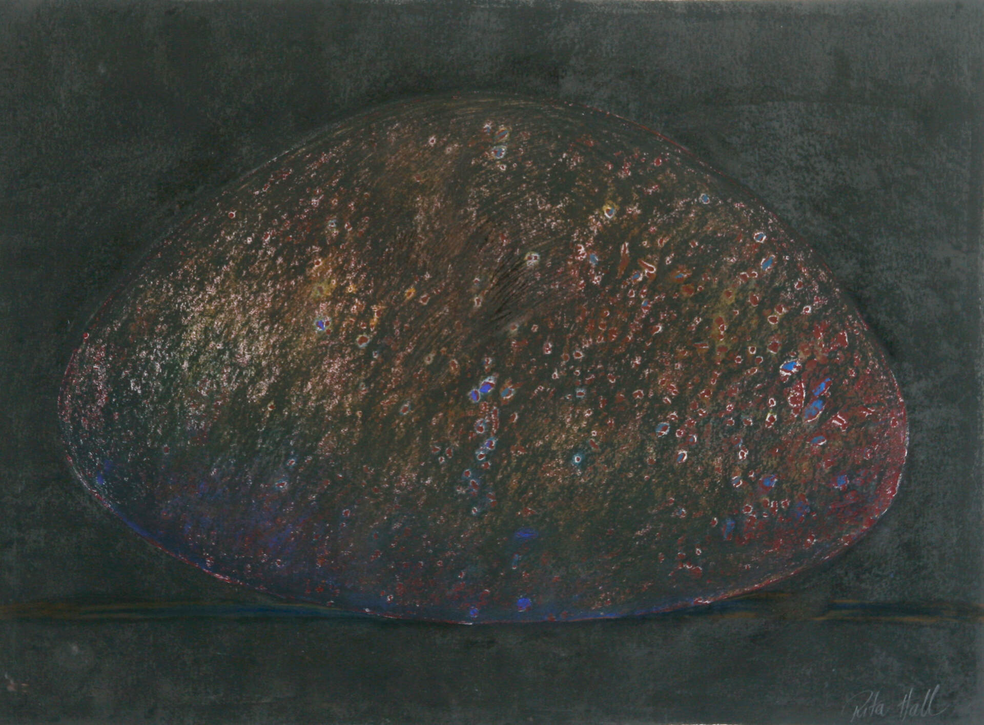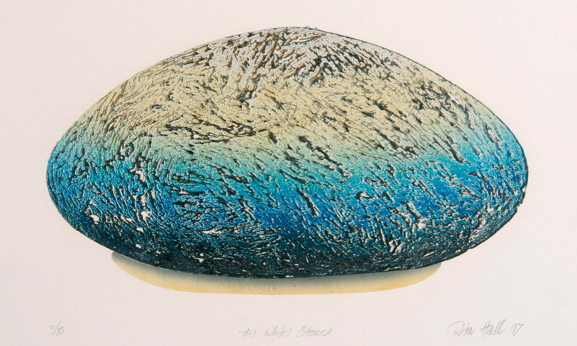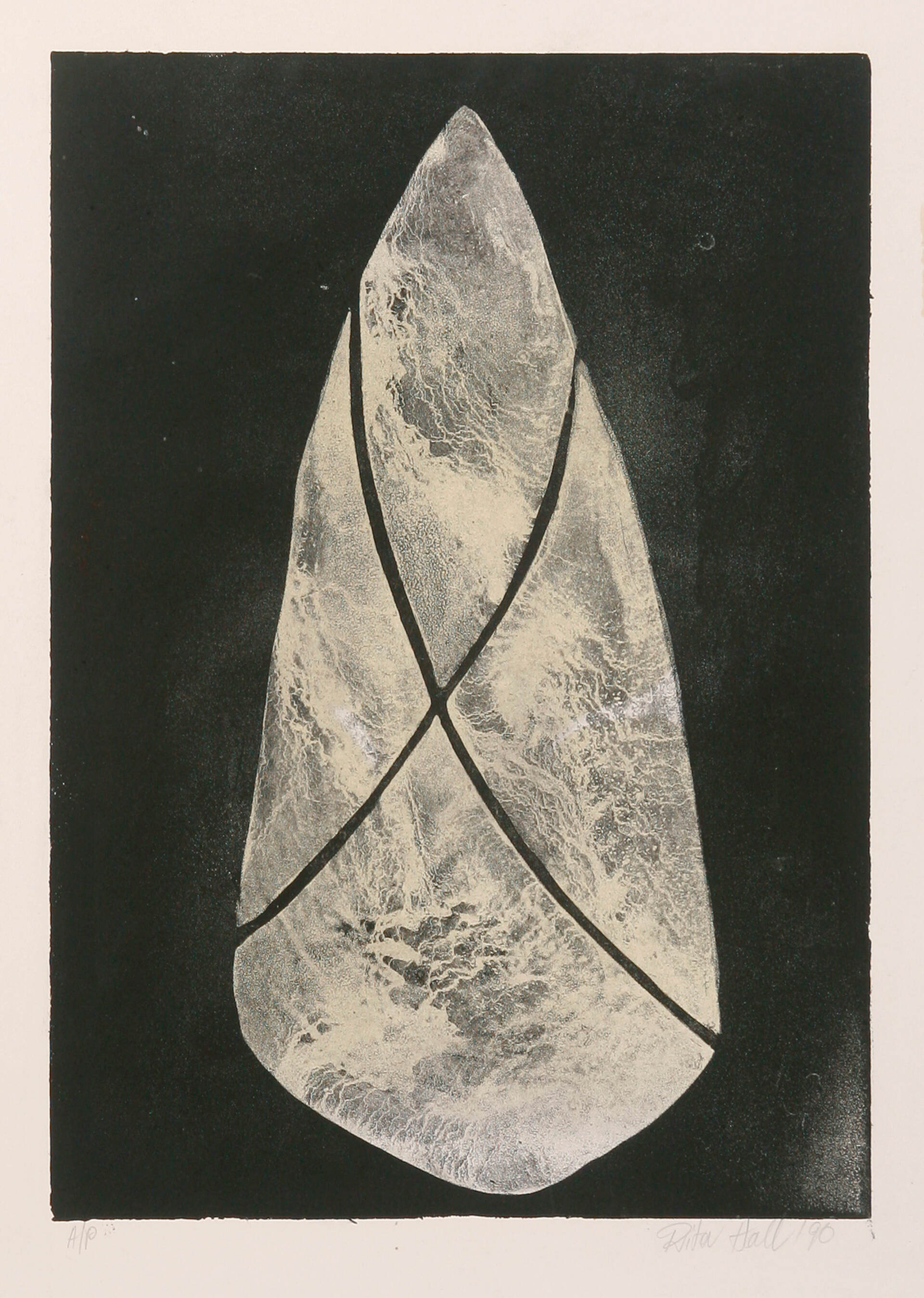 A grain of sand became a rounded stone in a picture, in a space, with a shape, with a dimension, a surface, a shadow perhaps, a solidarity, with its weight and all full of possibility. So began a new starting point rich with the potential for the making of future art works. I began a collection of rounded stones. Some were abandoned but many became models for drawings. They were exploited for many reasons and a body of new works became manifest. I made collographs, lino prints, etchings, lithographs, with also many drawings, paintings and pastels. A small group of the stone works were exhibited at Reade Art Gallery in 1990.