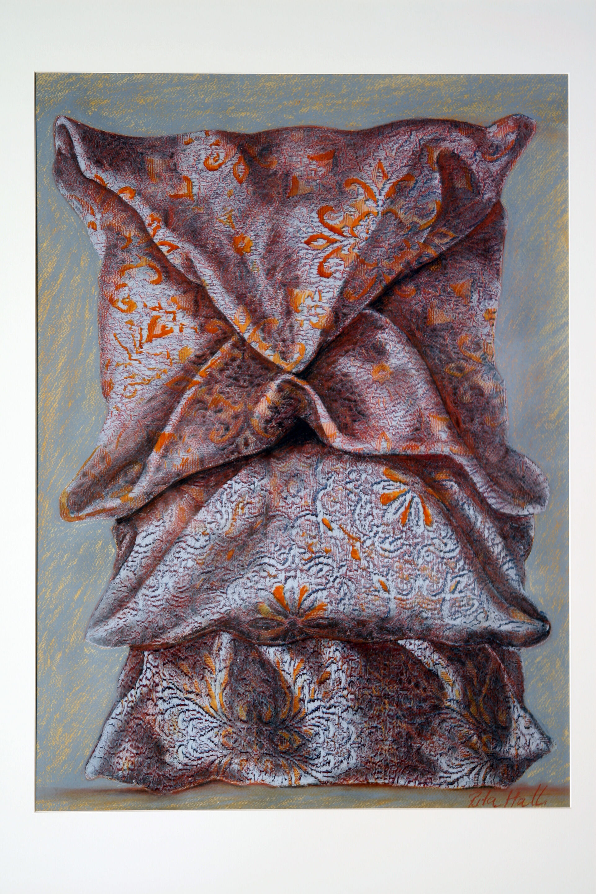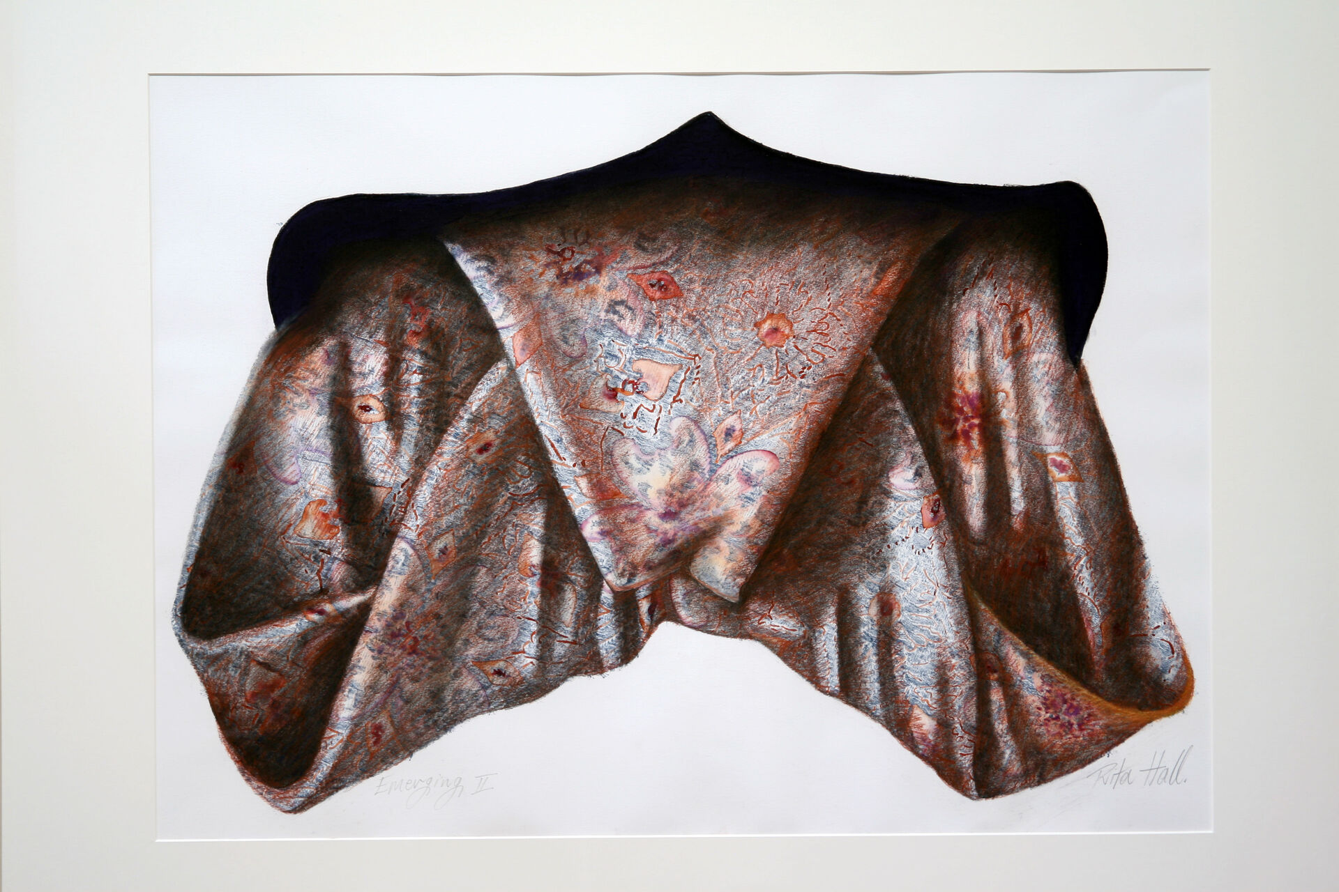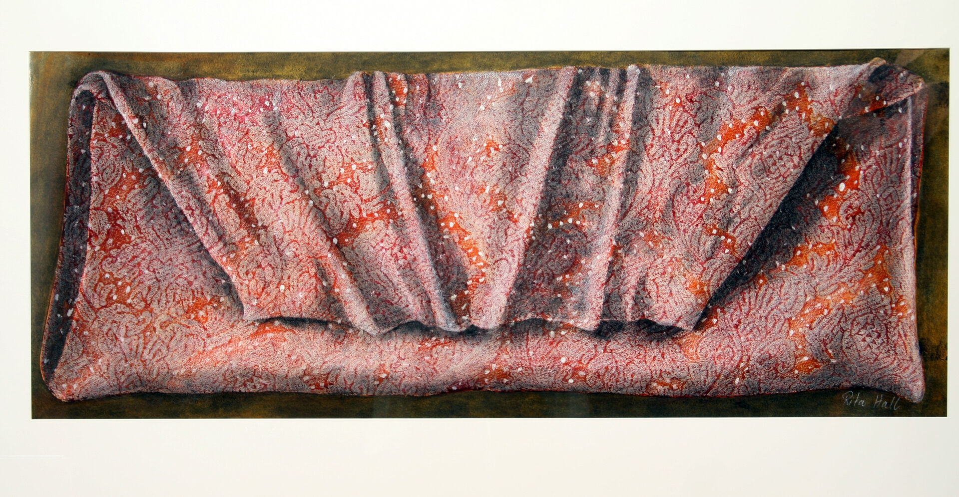 One of the most telling expressions of this desire is in the use of fabrics. An affinity for textiles has long been a defining strength of Rita’s work. Indeed, through more than 30 years of printmaking, she has repeatedly explored the possibilities of fabric textures and patterns. This is partly a legacy of her European background and a childhood surrounded by beautiful household cloths.