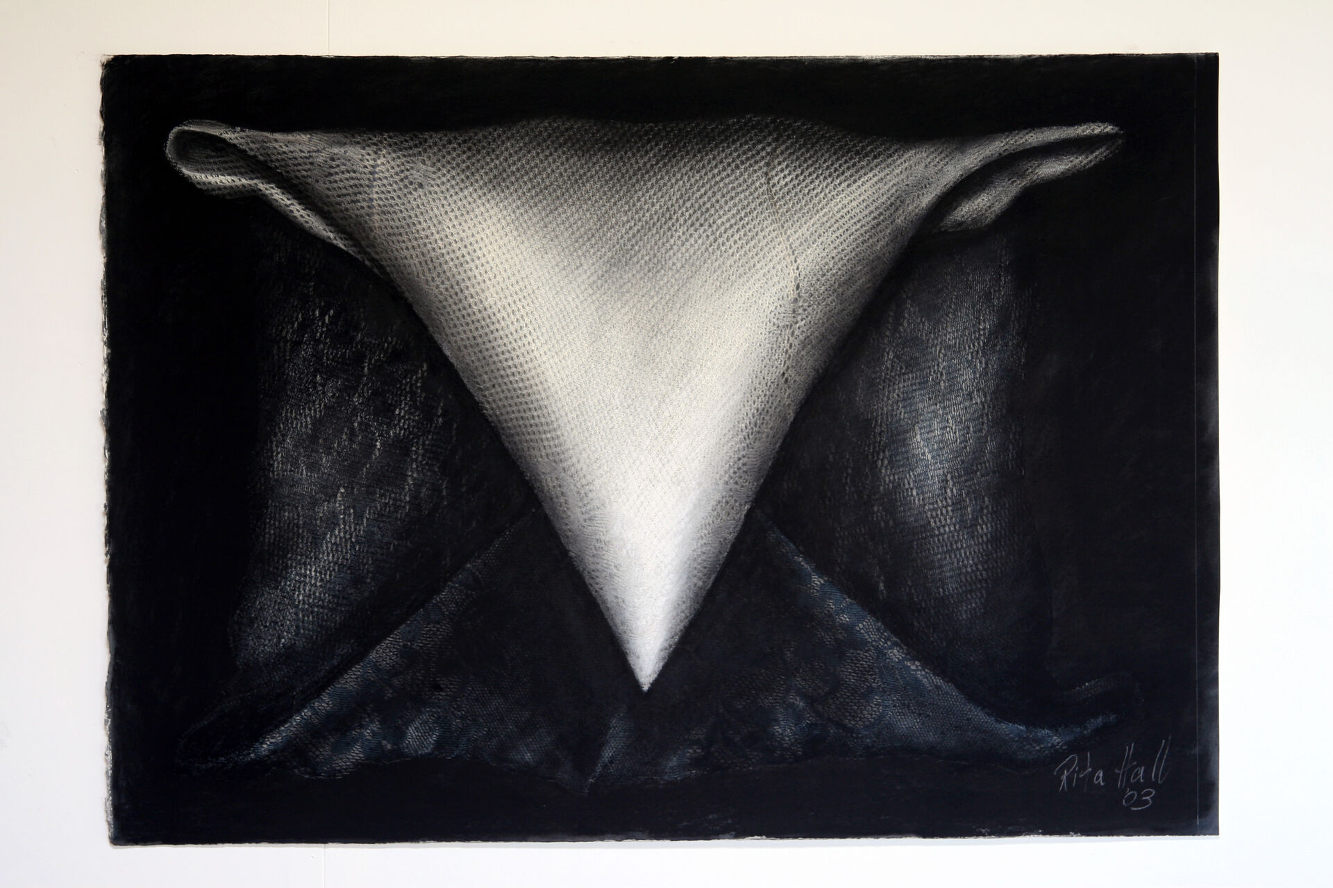 Rita Hall happens to be a neighbour of mine and over the past two years I’ve had the privilege of watching these images taking shape. While there are links to her earlier work, this latest series marks a new departure. It has its origins in a time when the artist was dealing with a difficult illness – one that put at risk her eyesight, hearing and sense of self.