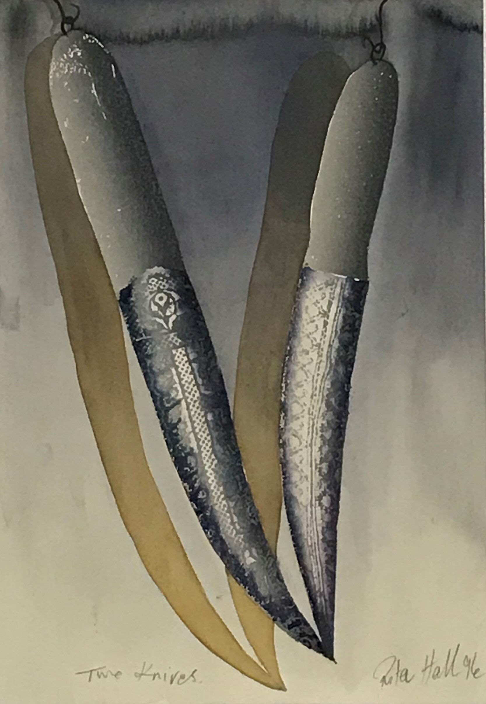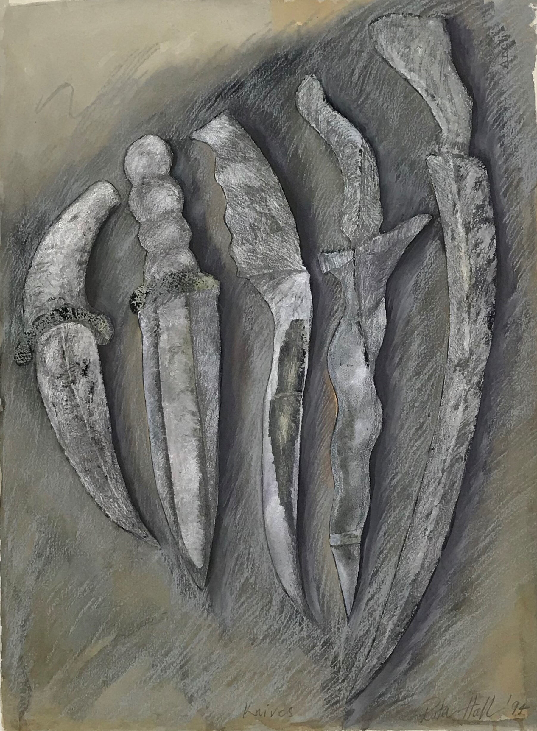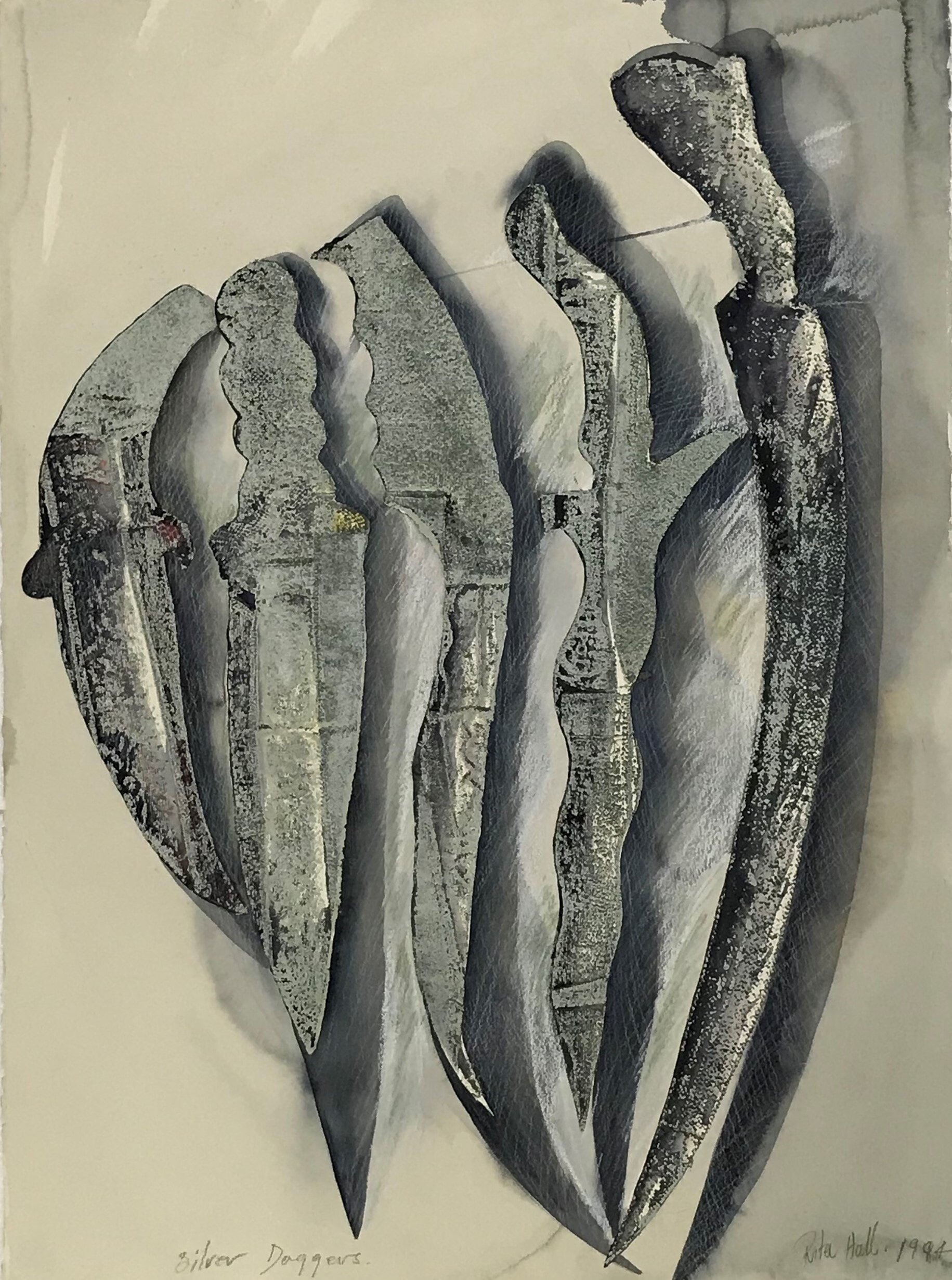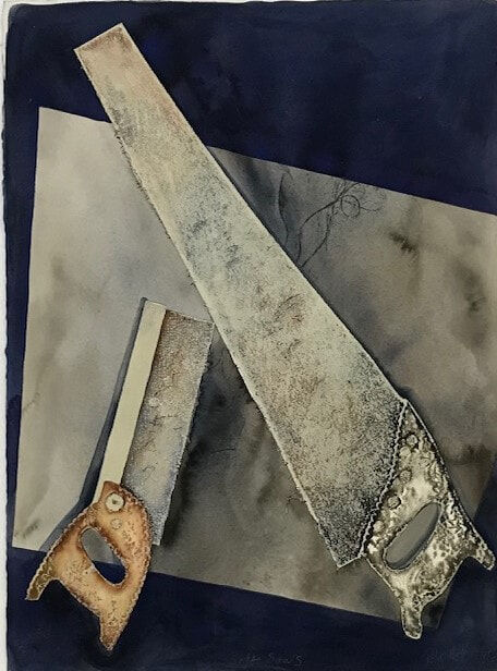 I now had a new armory of techniques and skills in printmaking along with a range of subjects which led to further possibilities for expression. Always curious about how things would look as art works I began to make new prints of objects in formal arrangements within the traditions of still-life composition. Knives, saws, blades, scissors and various tools started to appear, often as collographs using laces, leathers and textured fabrics.