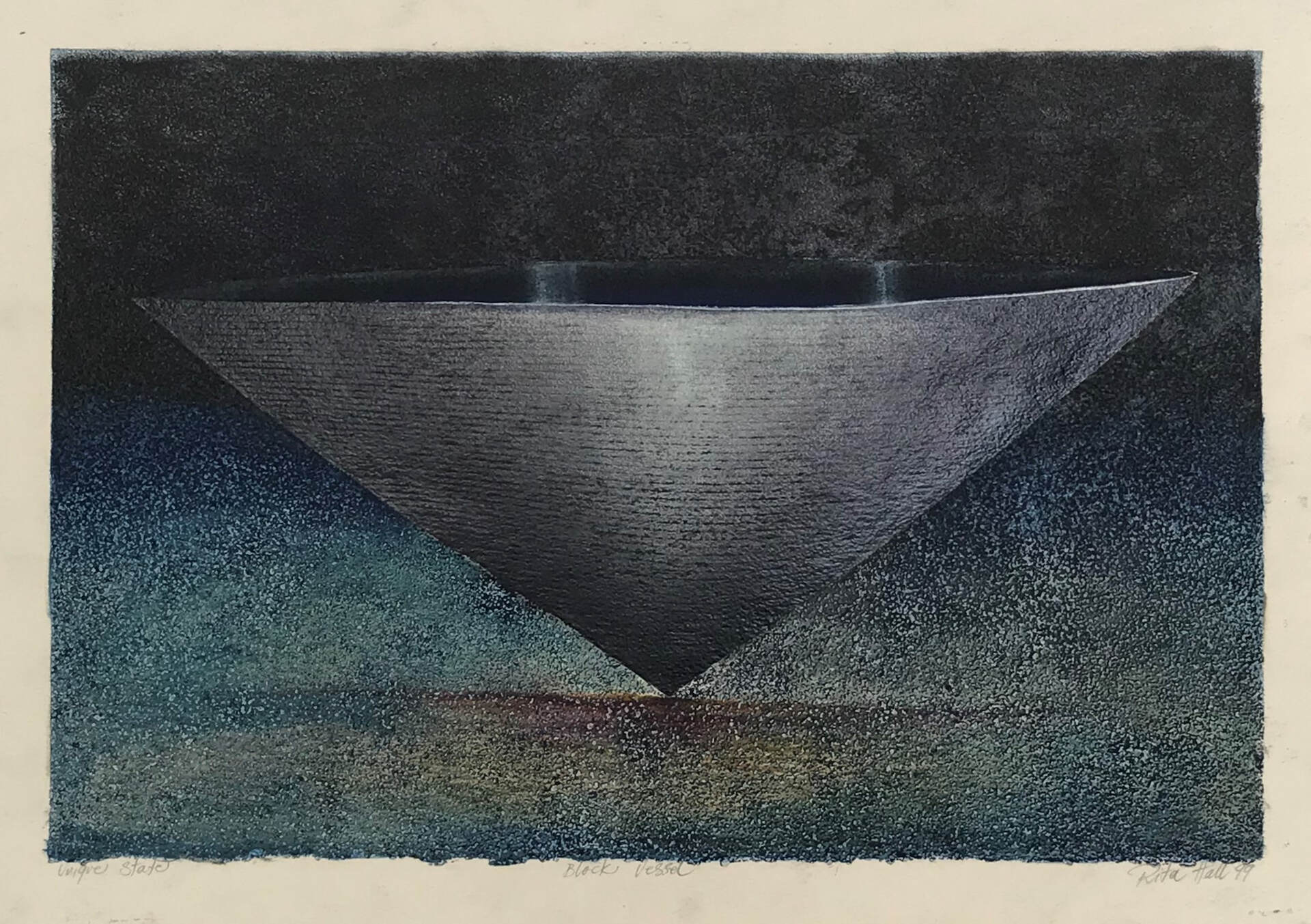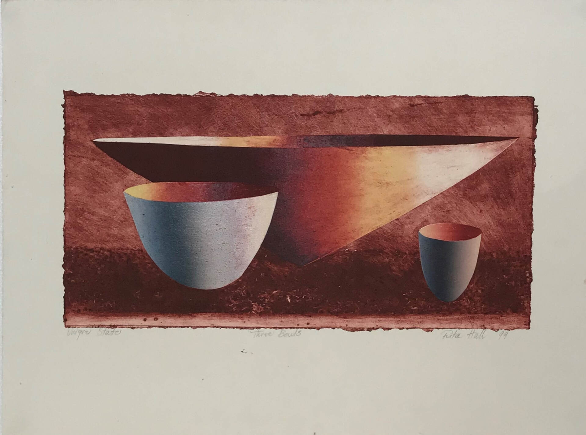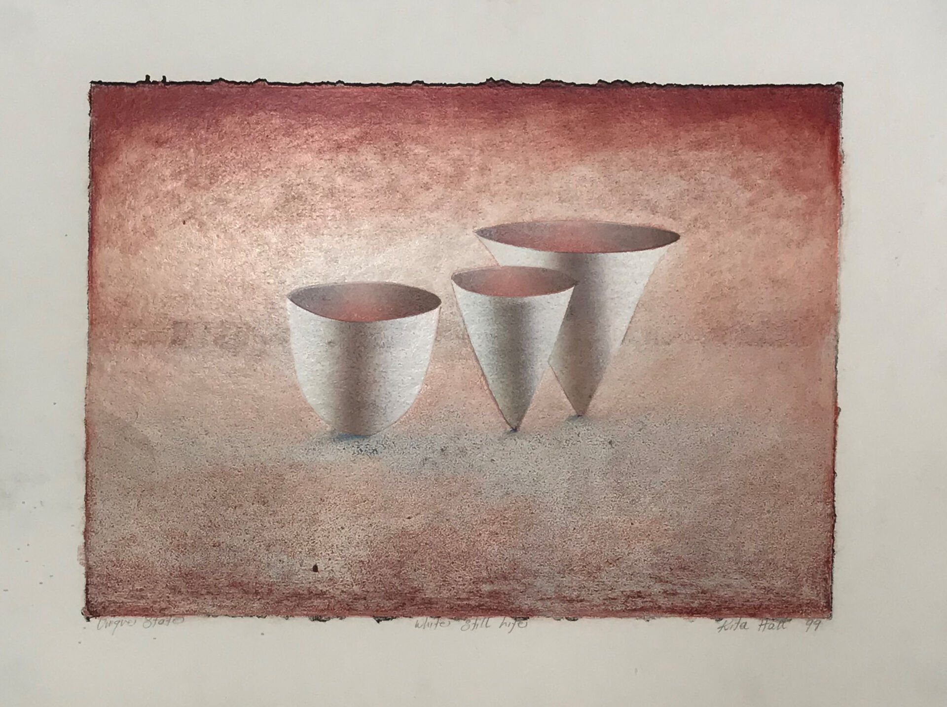 Gradually an entire new series emerged as simple still life arrangements in various setting along with stone like shapes and dynamic triangular vessels forms. The collections of finished prints, usually as unique states were shown widely and Marianne and I shared several exhibitions. One was in Sydney at the Ceramic Gallery as well as SALA Open Studio days. My prints from this series continued throughout the years, often as a way of developing new technical ideas within a pleasing and decorative format.