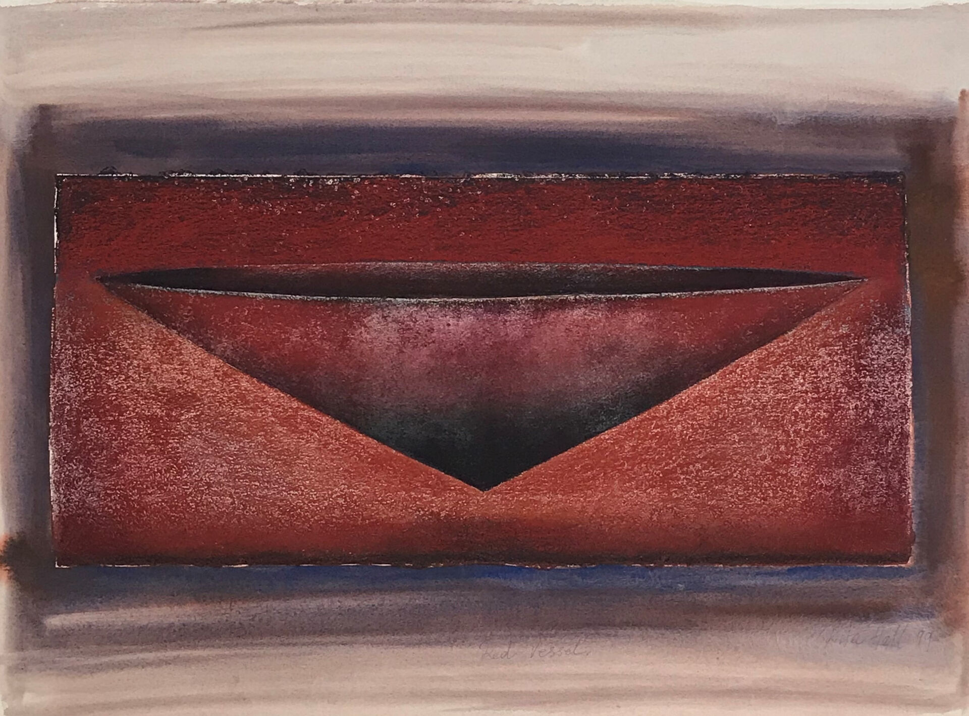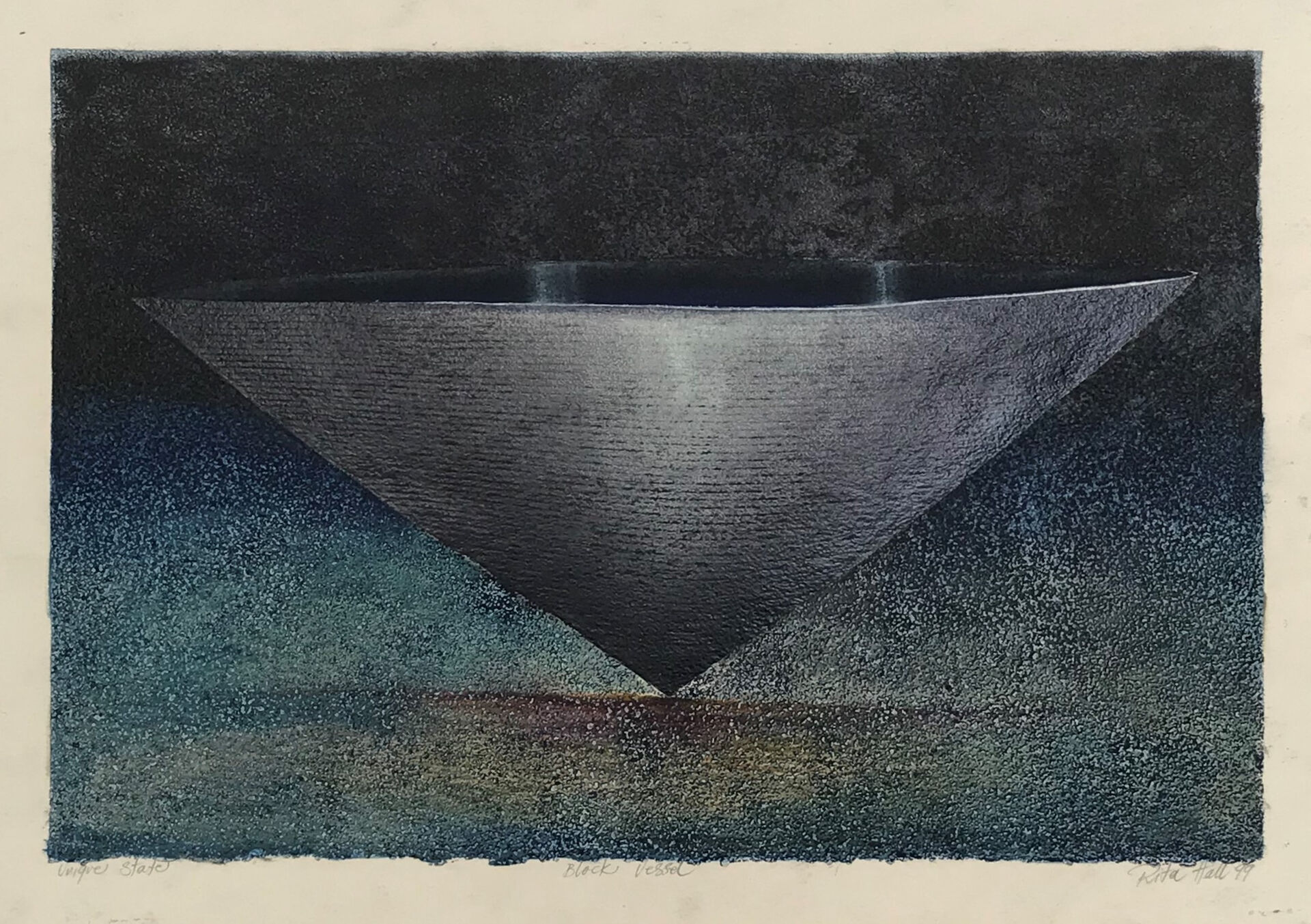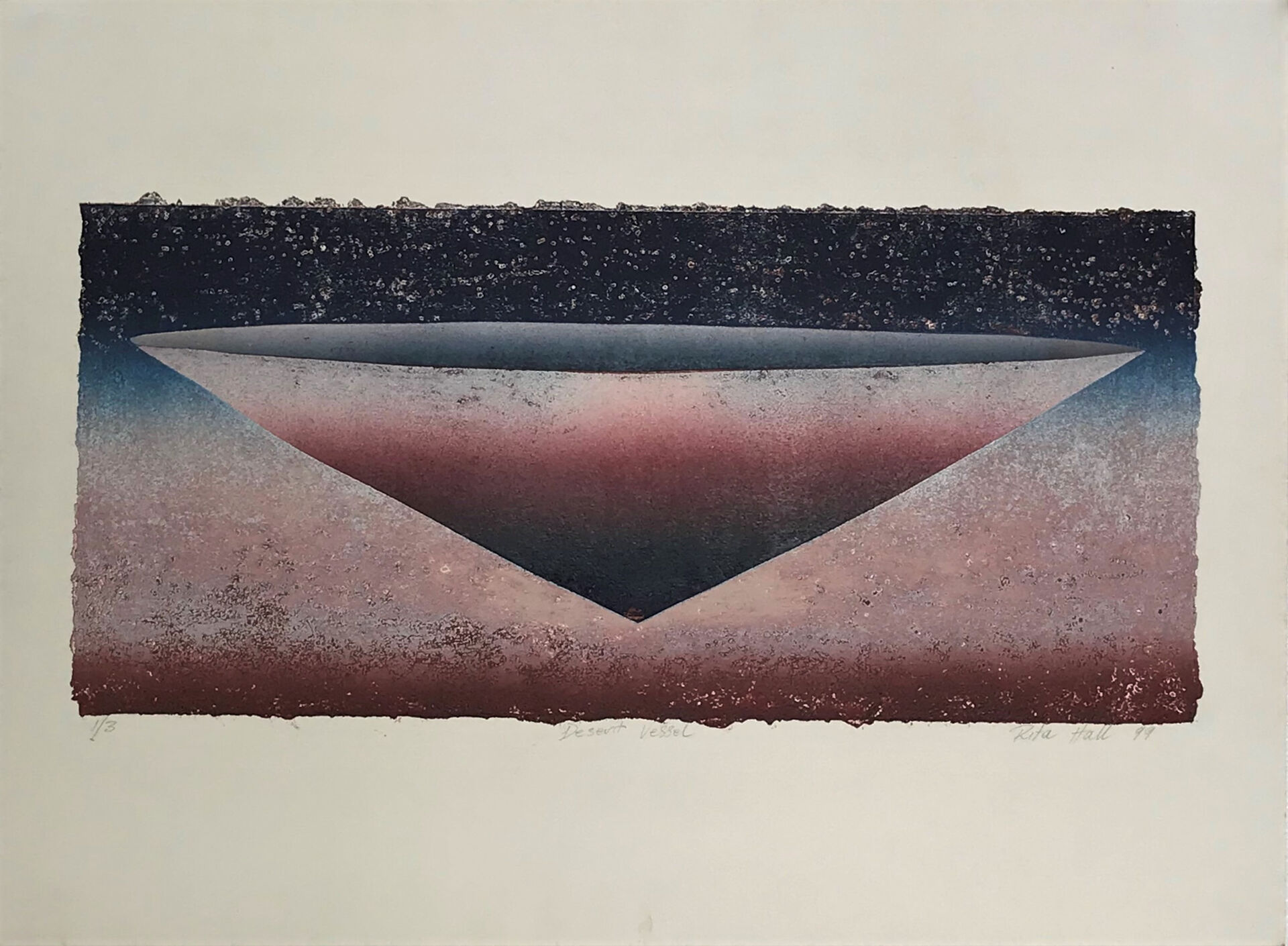 Gradually an entire new series emerged as simple still life arrangements in various setting along with stone like shapes and dynamic triangular vessels forms. The collections of finished prints, usually as unique states were shown widely and Marianne and I shared several exhibitions. One was in Sydney at the Ceramic Gallery as well as SALA Open Studio days. My prints from this series continued throughout the years, often as a way of developing new technical ideas within a pleasing and decorative format.