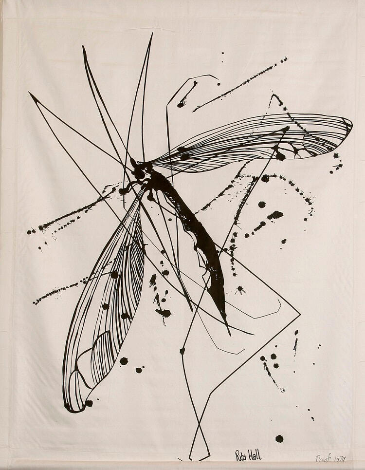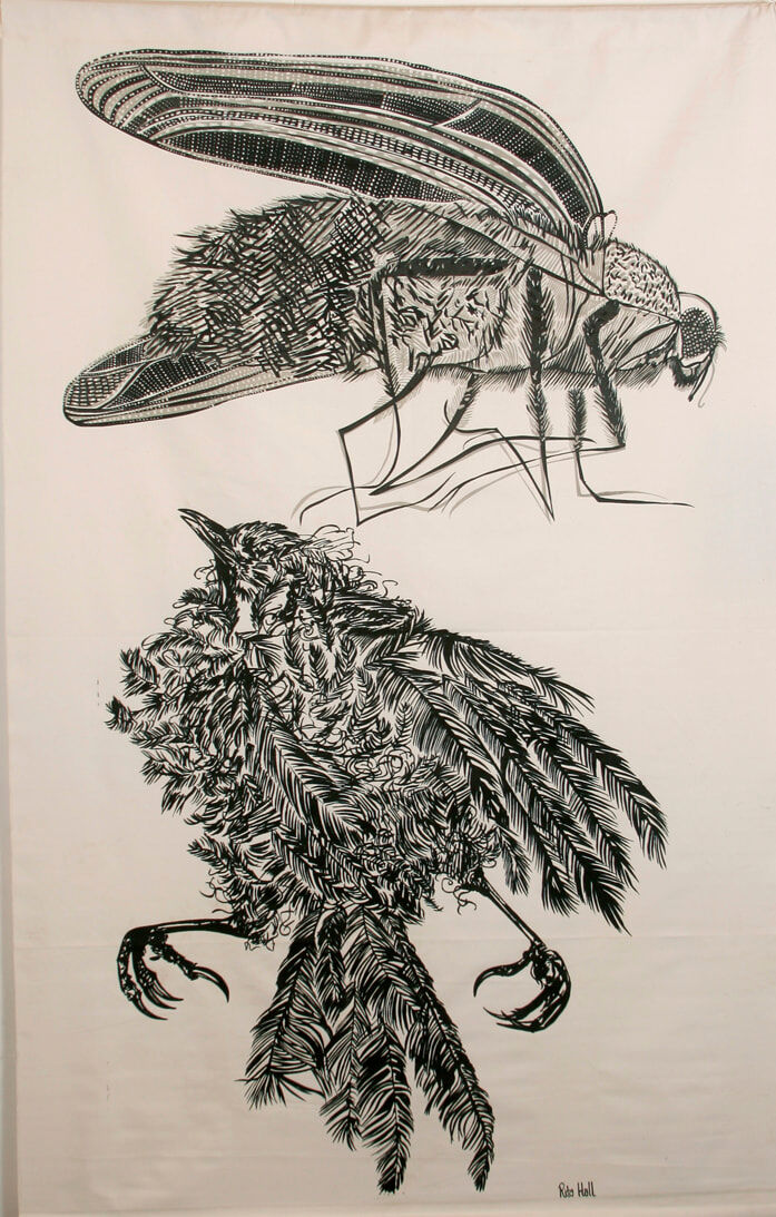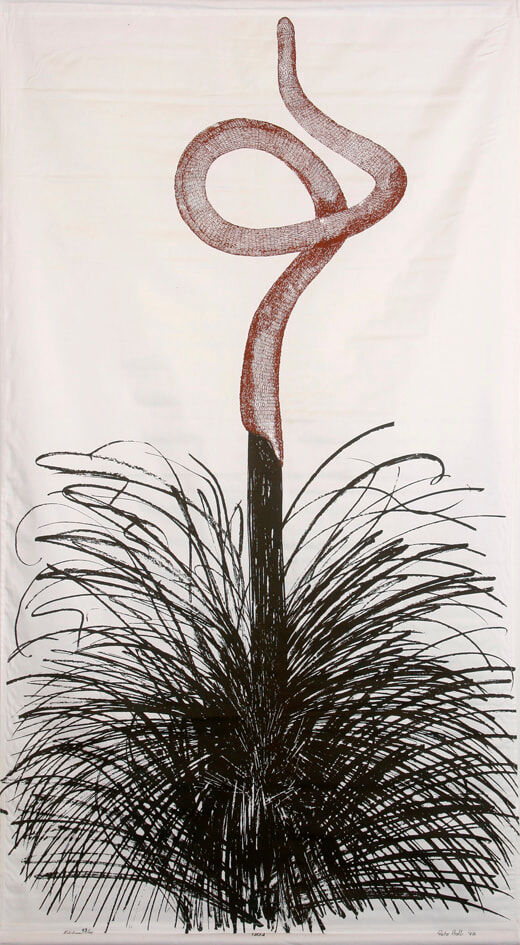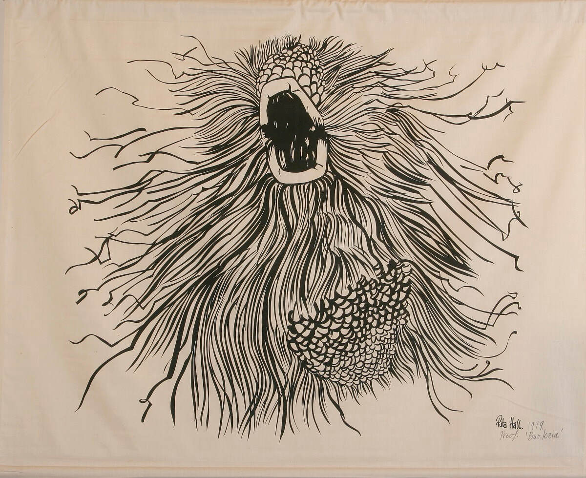 In 1978 David Jackson and I married, purchased a house in the Adelaide Hills, built a large shed and a seven-meter printing table and began production. The first design was a large, dried banksia flower, the next was a huge blow fly. Many more followed these, all made from hand cut stencils until I purchased a vacuum frame and arc lamp to make designs directly from charcoal drawing on drafting film. I made 90cm X 3meter lengths with repeat designs using screen printed methods. Immediately they were admired, I think due to the audacity of the designs which were of animals, birds, grass all made with quirky flourishes. Terry Eyre who owned Studio 20 Craft Gallery in Blackwood purchased some lengths and asked me to produce a full exhibition. I did and filled the gallery with textile lengths. Strangely the public seemed to love the work but wanted to buy one meter. They wished to sew them into wall hangings which of course led me to redesign all my previous work into single images, made into individual wall hangings with special hanging rails and sewn into manageable sizes for domestic settings.